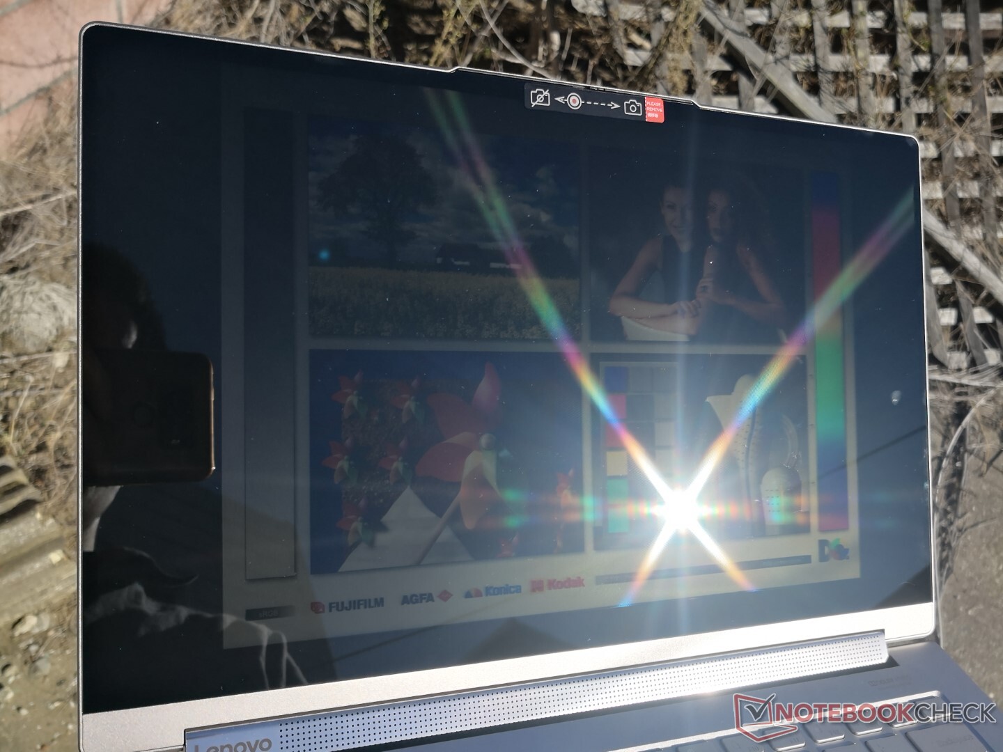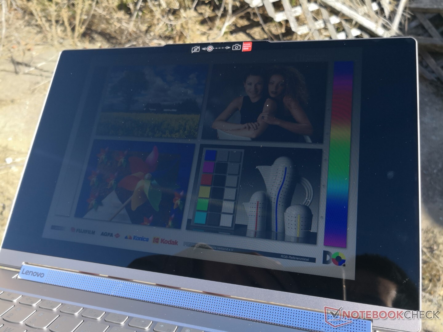 Lenovo heeft de Yoga 9i 14 uitgerust met dezelfde hoge kwaliteit LG Philips LP140WF9-SPE2 IPS-paneel als op de Yoga C940 14 van vorig jaar. De Yoga 9i biedt dus bijna dezelfde visuele ervaring als op de Yoga C940 14. De helderheid van het scherm blijft gemiddeld voor een high-end cabriolet, want concurrerende modellen als de XPS 13, HP Spectre x360 13 of Samsung Notebook 9 Pen hebben allemaal een helderder scherm voor een betere zichtbaarheid buitenshuis.