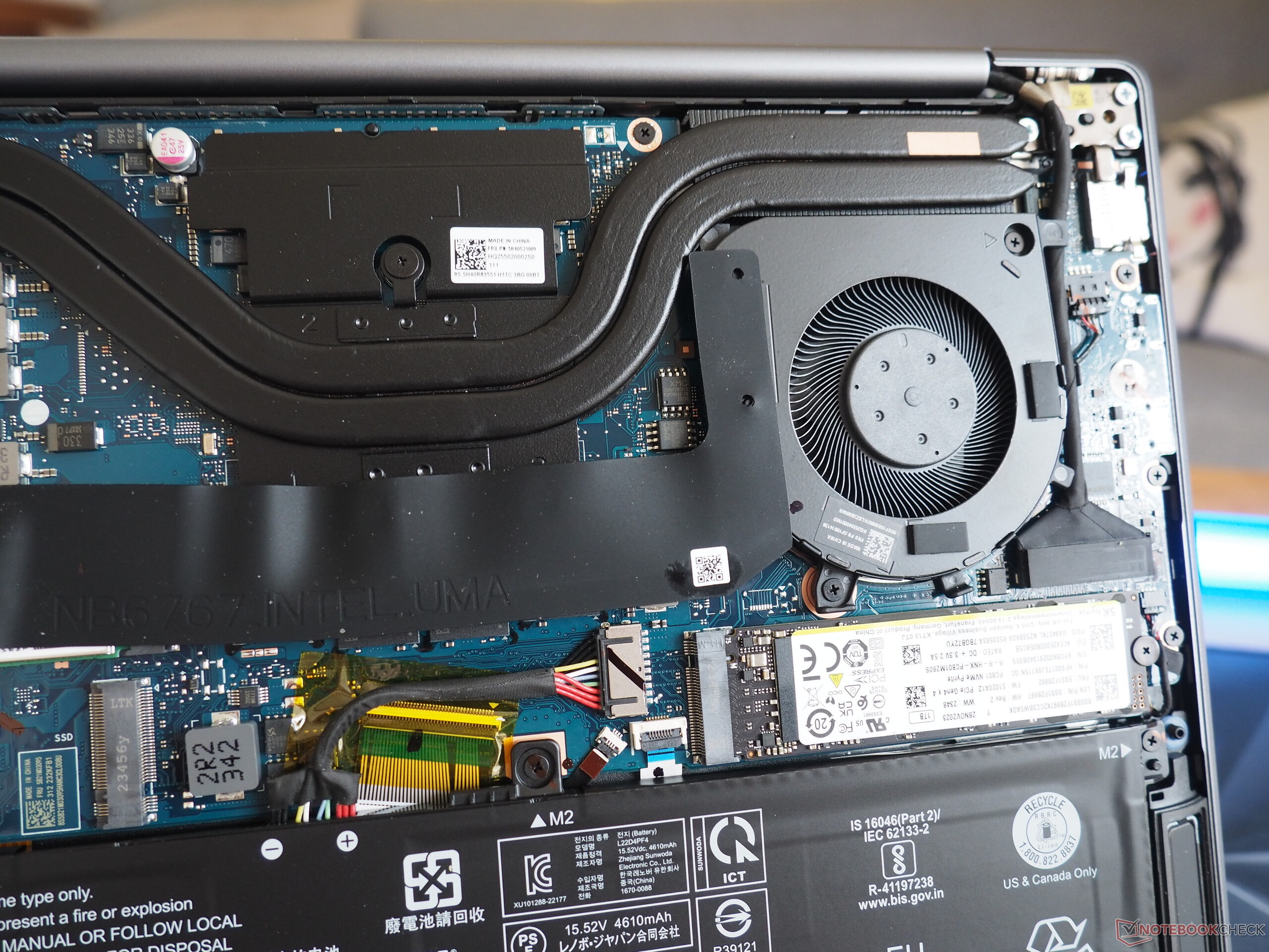 Onderhoud is vrij eenvoudig. Nadat u zes Torx-schroeven hebt losgedraaid, kunt u de bodemplaat uit de verankering halen (begin bij voorkeur aan de achterkant). Binnenin het apparaat bevinden zich het koelsysteem (twee ventilatoren plus twee heat pipes), de W-Fi-module, de batterij en twee M.2-sleuven waarvan er nog één vrij is.