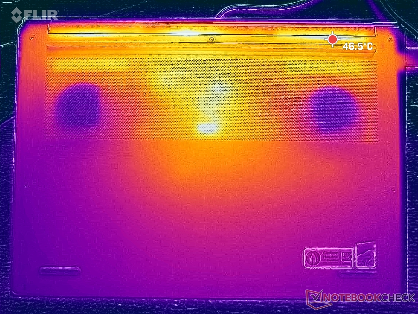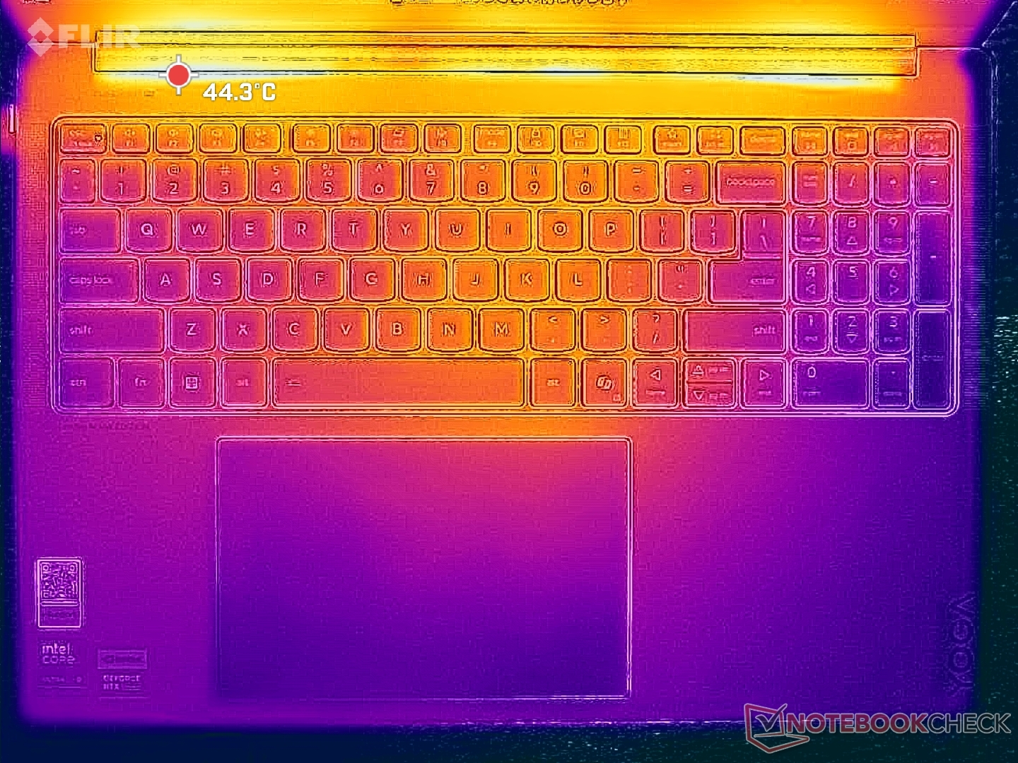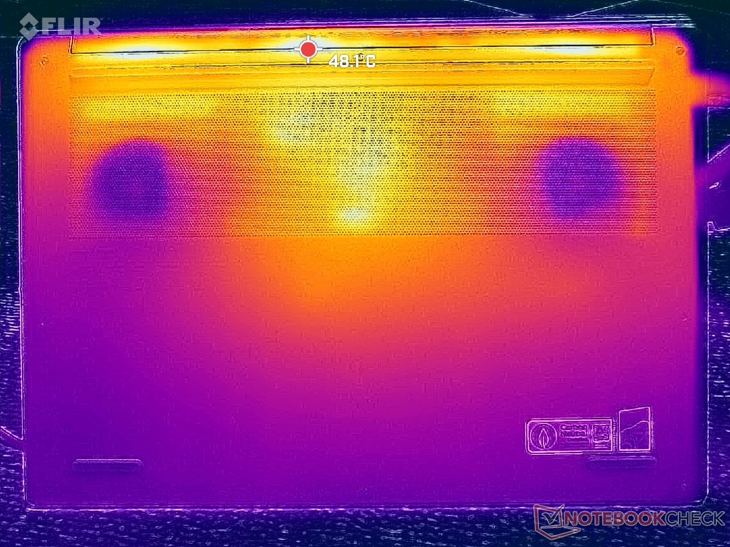 De oppervlaktetemperaturen tijdens het uitvoeren van veeleisende belastingen zijn merkbaar koeler dan wat we hebben gemeten op de RTX 5070 configuratie. Hete plekken tijdens het stationair draaien van Cyberpunk 2077 bereikten iets meer dan 35 C en 42 C op respectievelijk het toetsenbord en de onderkant, vergeleken met 42 C en 46 C op de snellere RTX 5070.