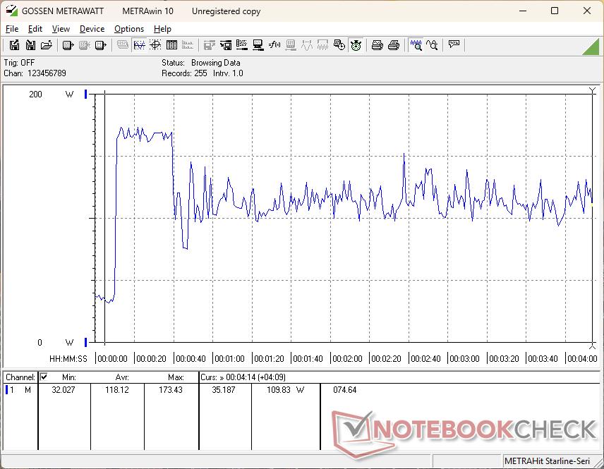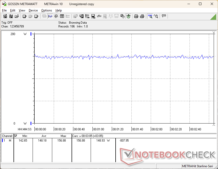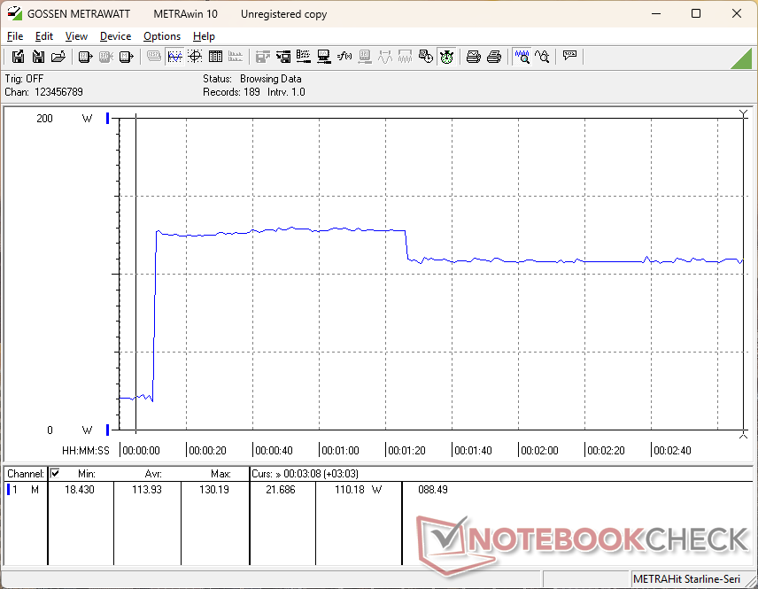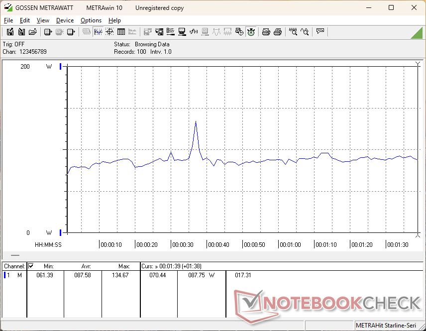 Het verbruik kan zo laag zijn als 7 W in de iGPU-modus met het scherm ingesteld op minimale helderheid of meer dan 22 W in de dGPU-modus en maximale helderheid. Tijdens het gamen verbruikt het systeem echter maar een paar watt minder dan de veel snellere RTX 5060 of 5070 opties. Upgraden naar de RTX 5060 configuratie zou bijvoorbeeld slechts 6 procent meer stroom verbruiken voor 20 tot 30 procent snellere gamingprestaties.