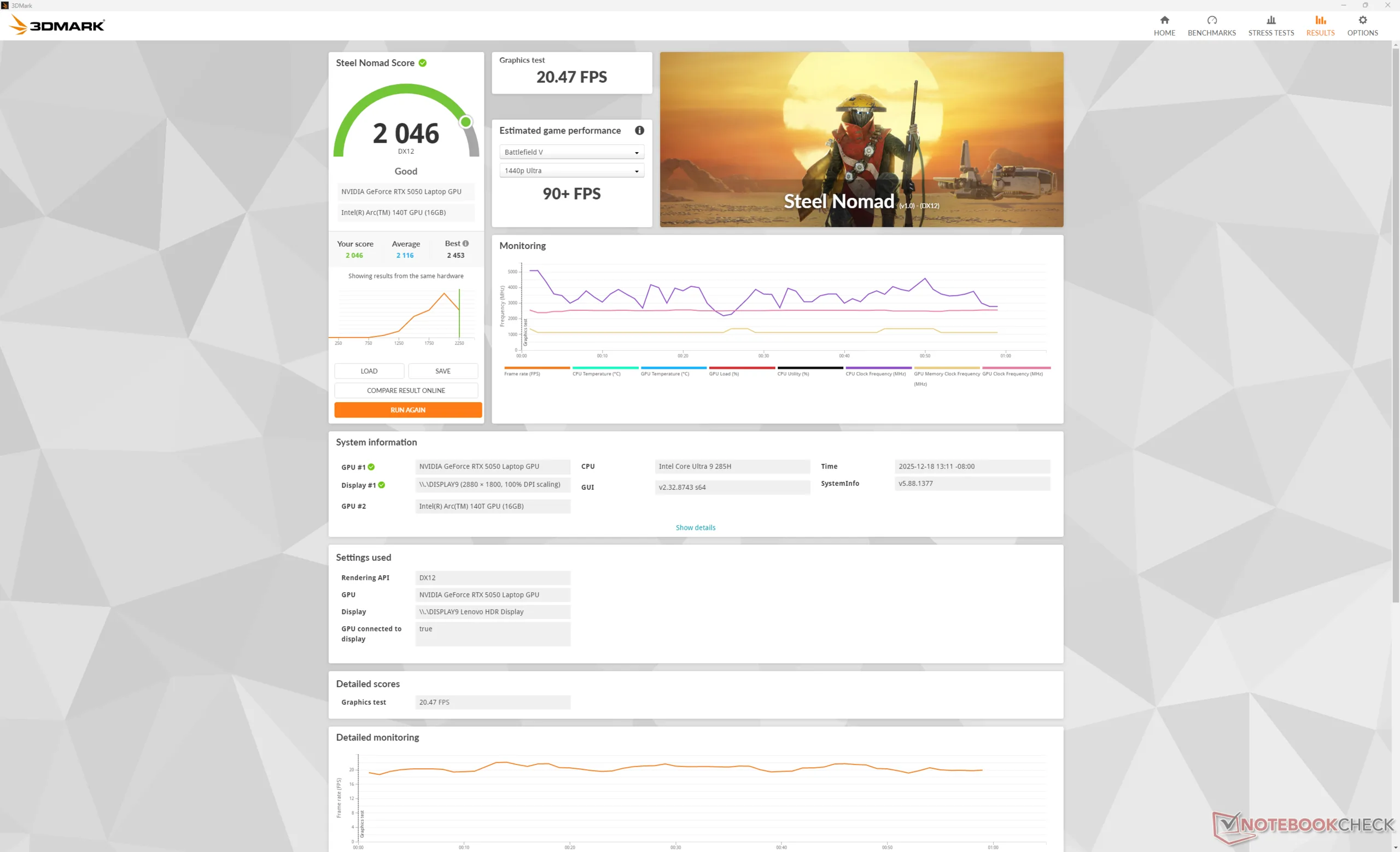 Erger nog, kiezen voor de RTX 5050 configuratie betekent niet noodzakelijkerwijs een langere batterijlevensduur of stillere ventilatoren tijdens het gamen of het uitvoeren van zware belastingen, ondanks de langzamere prestaties. De Core Ultra 9 285H biedt zelfs niet veel verbetering ten opzichte van de goedkopere Core Ultra 7 255H, maar SKU's met de laatstgenoemde CPU zijn helaas moeilijker te vinden in de VS. De looptemperaturen zijn misschien koeler, maar dit kleine voordeel verbleekt in vergelijking met de langere lijst van nadelen ten opzichte van de interessantere RTX 5060 optie.
