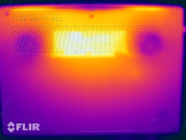 Zelfs tijdens dagelijks gebruik is de behuizing van de Yoga Slim 7 Pro enkele graden warmer dan normaal, maar er zijn geen beperkingen als gevolg hiervan. Onder belasting zijn er enkele hotspots aan de onderkant met meer dan 50 °C (122 °F) en u kunt het apparaat op dergelijke momenten beter niet op uw schoot leggen.