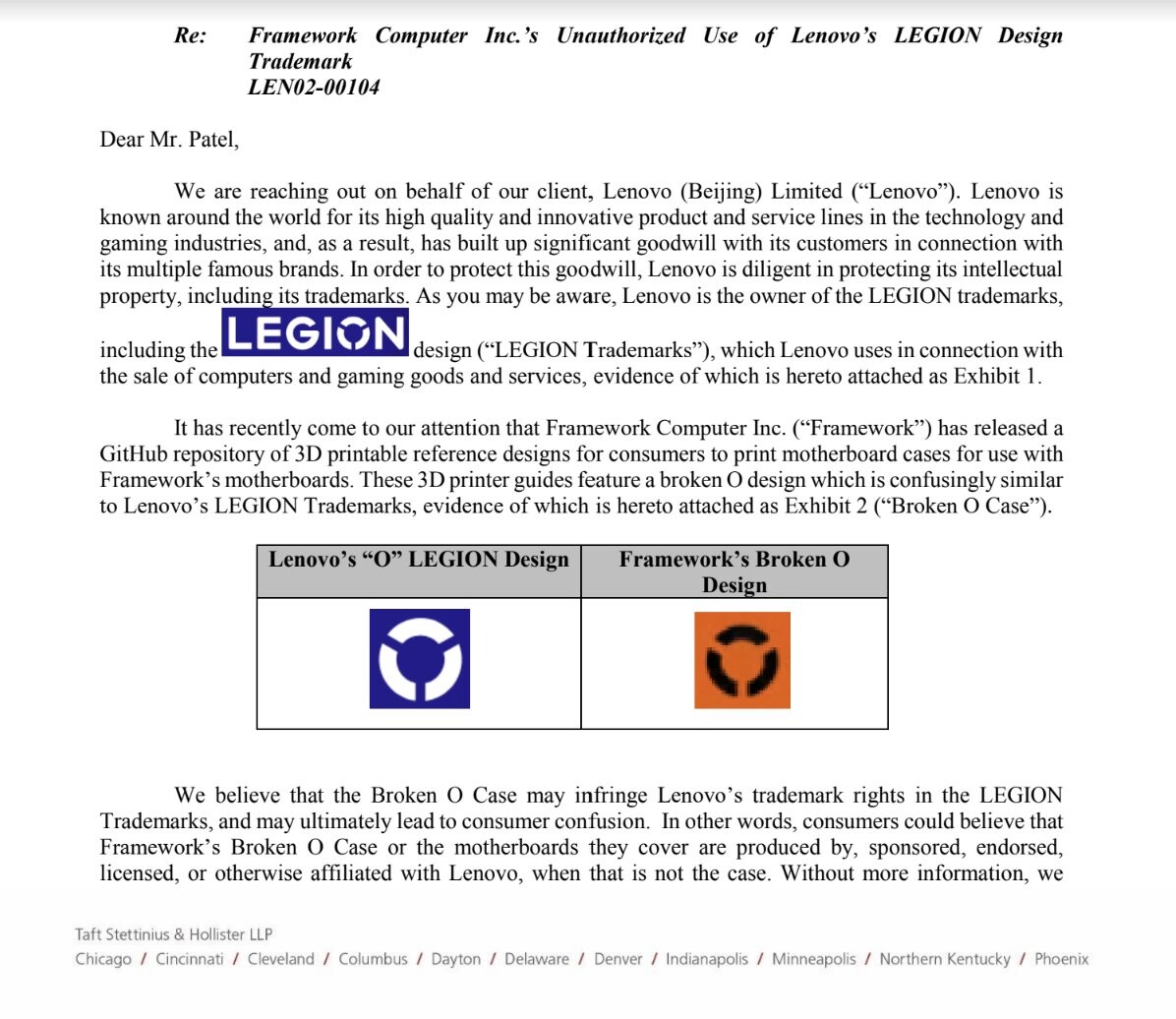 Het is vermeldenswaard dat Framework de drie staven die de knop verbinden met het bredere chassis heeft opgenomen vanwege de beperkingen van 3D-printen. Kortom, het zou onwaarschijnlijk zijn om een zwevende powerknop te maken met de meeste 3D-printers. Hoe dan ook, Lenovo voegt eraan toe dat mensen ten onrechte kunnen denken dat de behuizing en het moederbord erin gerelateerd zijn aan Lenovo en het merk Legion. We hebben het bezwaar van Lenovo hieronder gereproduceerd, waarin wordt verwezen naar de aan/uit-knop van de case als een 'Broken O Design'.