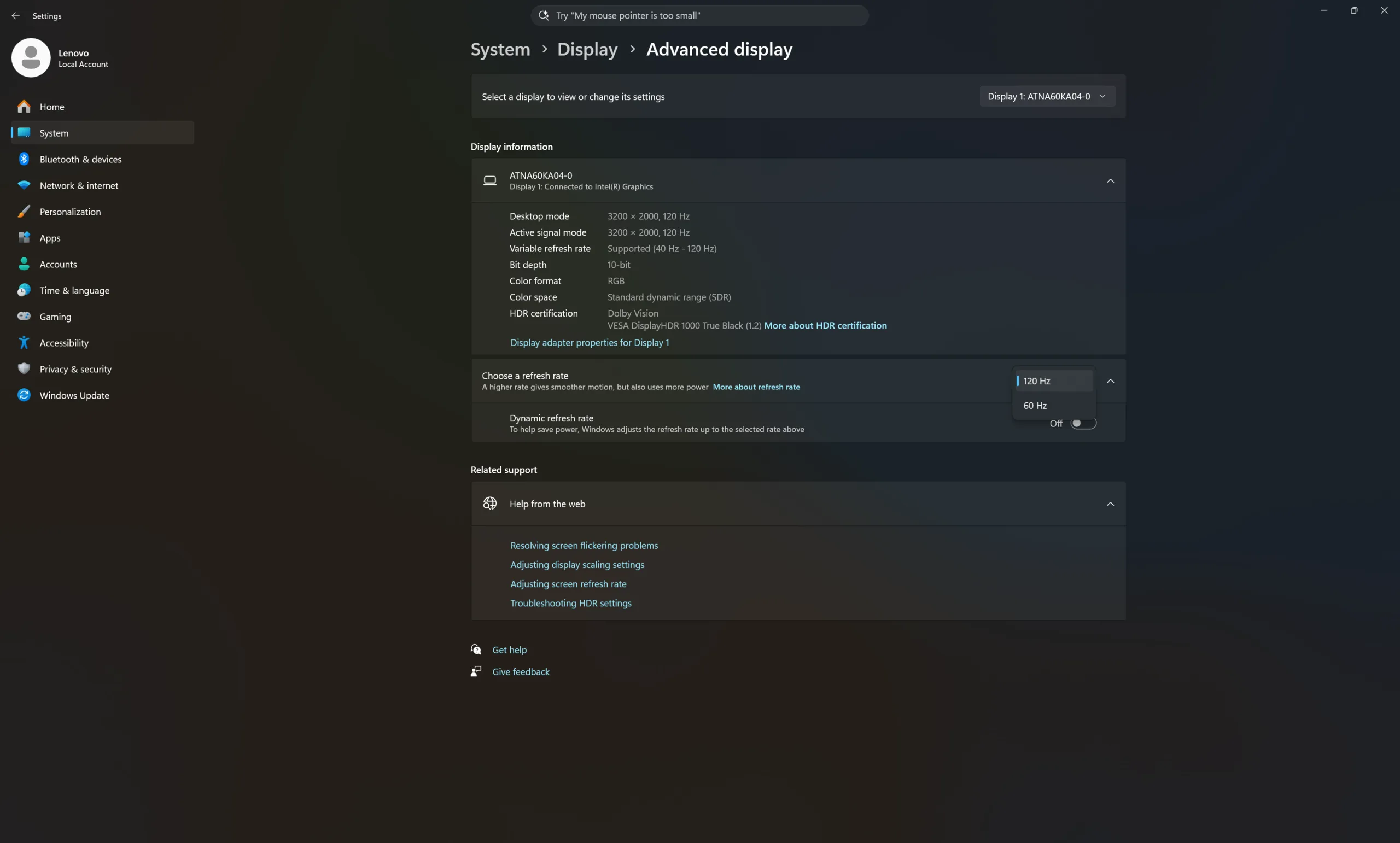 Vaker wel dan niet zijn de beeldschermen op de meeste Lenovo laptops standaard ingesteld op 60 Hz, zelfs als de panelen zelf snellere eigen verversingsfrequenties ondersteunen. De recente Yoga Slim 7 Ultra 14 Aura en Pro 9i 16 G11 ondersteunen bijvoorbeeld elk een eigen vernieuwingsfrequentie van 120 Hz en toch zijn onze beide testapparaten standaard ingesteld op 60 Hz. Onze Legion testapparaten worden daarentegen standaard geleverd met de hoogste vernieuwingsfrequenties. Dit suggereert dat Lenovo misschien met opzet al zijn niet-gaming modellen op 60 Hz instelt, mogelijk omwille van de levensduur van de batterij.