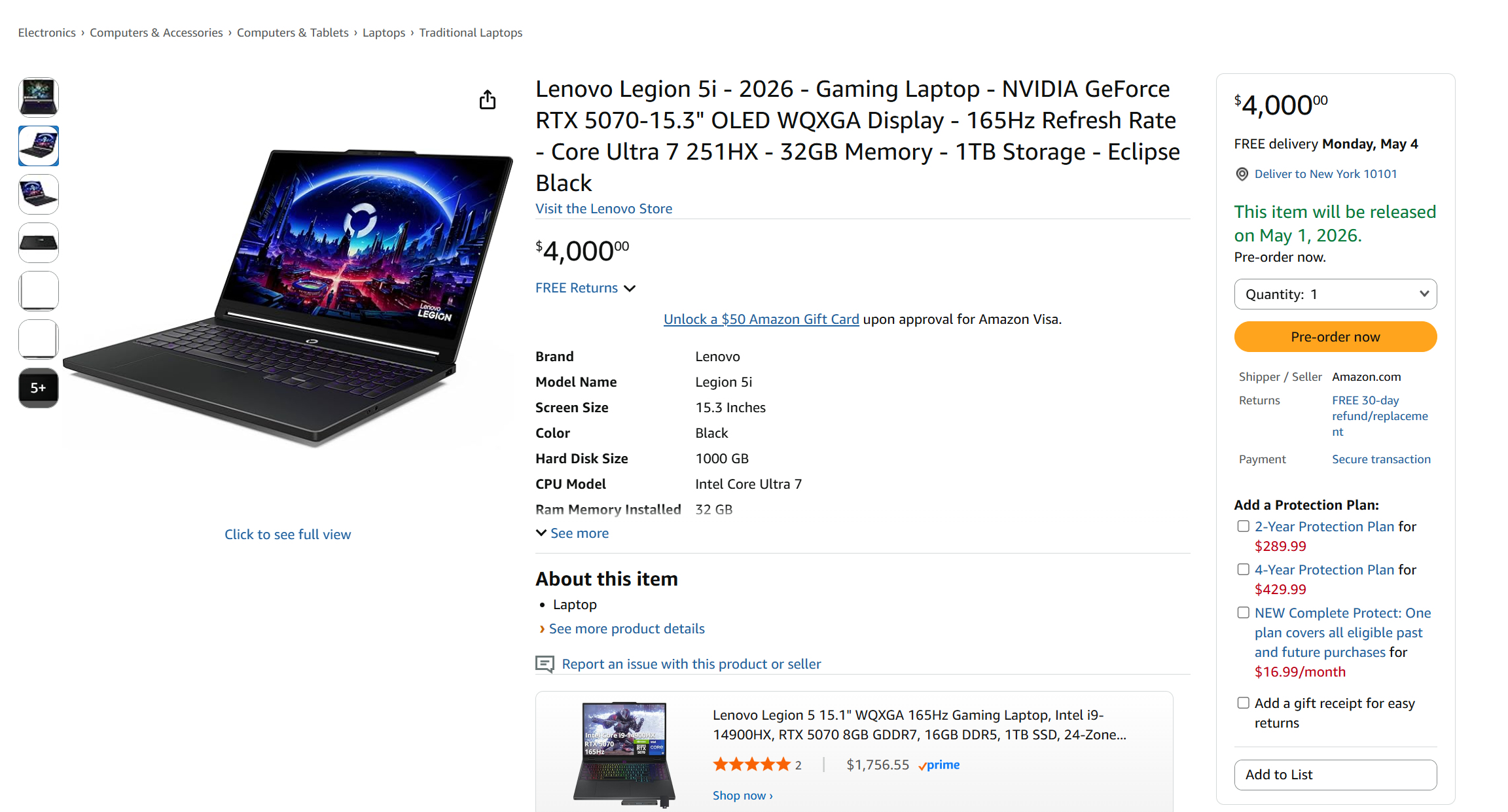 Ondertussen heeft X-gebruiker Huang514613 verschillende versies gespot die op Cendirect Canada en op Amazon US voor $4.000 worden verkocht. Zoals de afbeelding hieronder laat zien, heeft Lenovo de Legion 5i met een 15,3 inch OLED-scherm, 1 TB opslag en 32 GB RAM in een Eclipse Black afwerking. Met andere woorden, dit komt overeen met de hardware van bestaande Panther Lake-varianten.