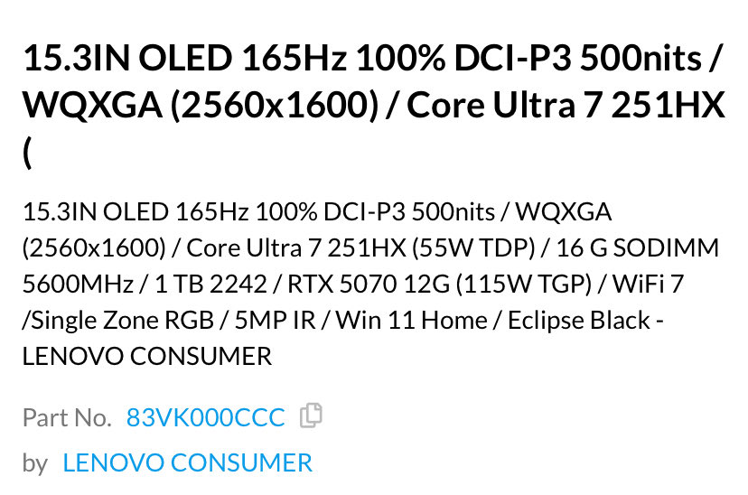 Hoewel dat allemaal verwacht wordt, noemt Amazon ook de nog niet uitgebrachte Core Ultra 7 251HX processor. Ondertussen vermeldt Cendirect Canada expliciet een 12 GB VRAM-versie van de Nvidia GeForce RTX 5070. Met een totaal grafisch vermogen van 115 W (TGP) lijkt deze nog niet uitgebrachte GPU klaar om te lanceren in de Yoga Pro 7 en ROG Zephyrus G14, naast andere gaming laptops.