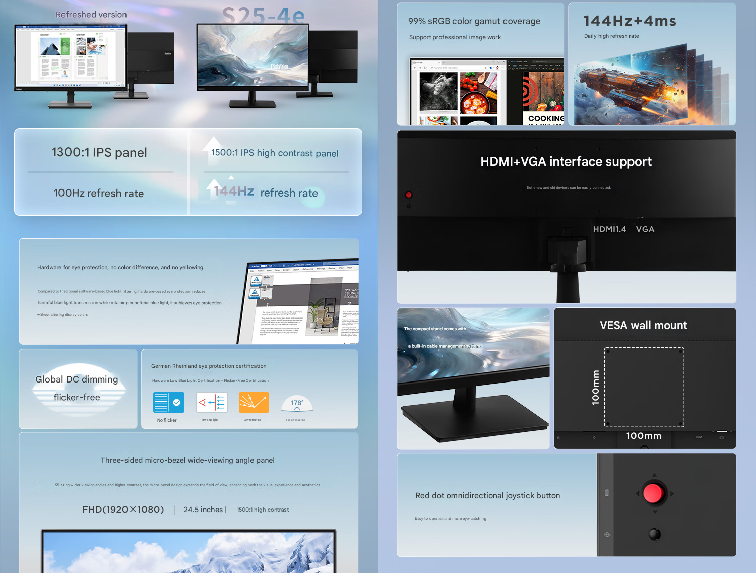 Met een contrastverhouding van 1500:1 belooft het paneel ook helder wit en donker zwart te bieden. Er is wereldwijde DC-dimming en meerdere oogbeschermingsfunctiesen hiermee belooft de Lenovo ThinkVision S25-4e een comfortabele kijkervaring te bieden tijdens langdurige sessies.