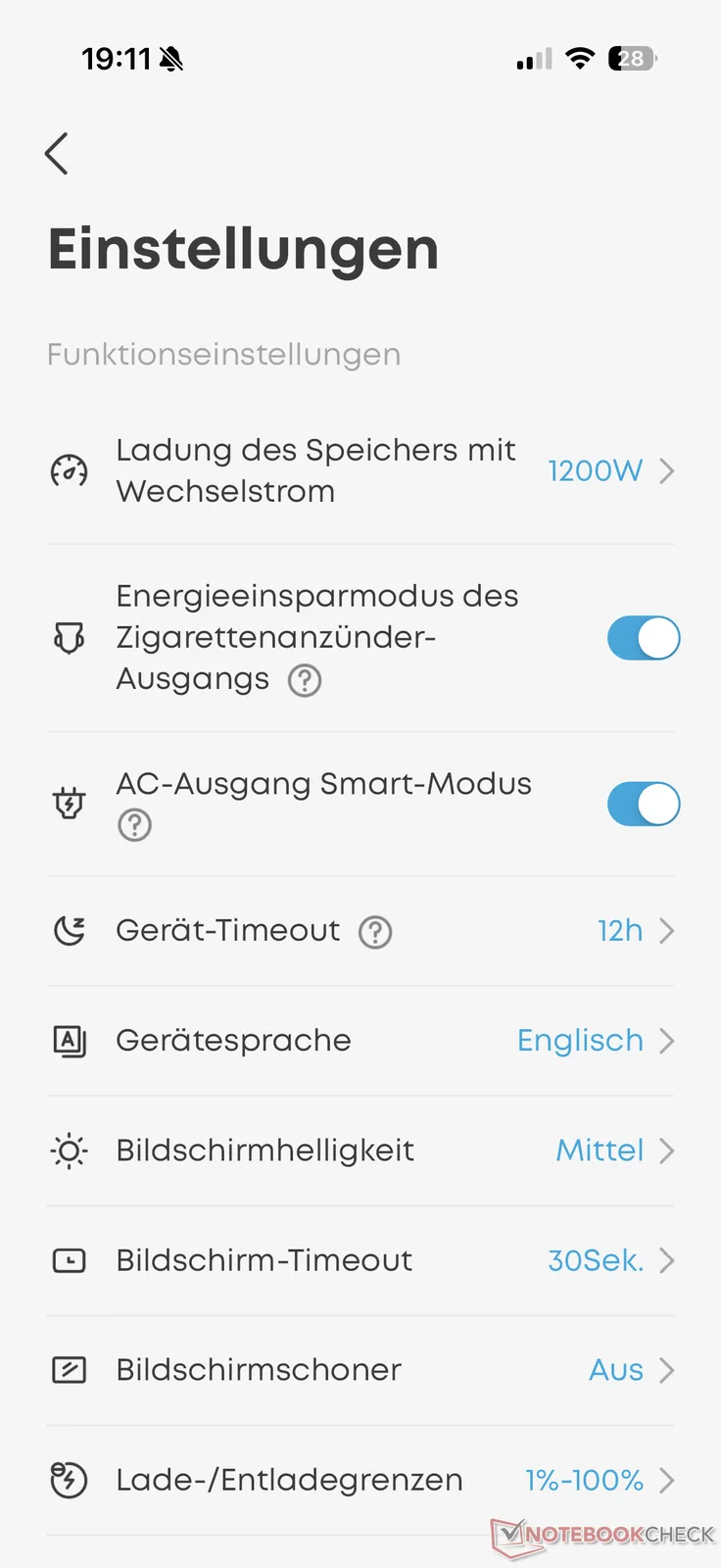 De app geeft ook informatie zoals het oplaadniveau van de batterij en de resterende gebruikstijd bij het huidige uitgangsvermogen, evenals de temperatuur van de batterijcellen. In het menu kunnen verschillende instellingen worden gemaakt voor de maximale laadsnelheid, energiebesparing, laad- en ontlaadlimieten en alle aspecten van het display. Firmware-updates zijn hier ook mogelijk.