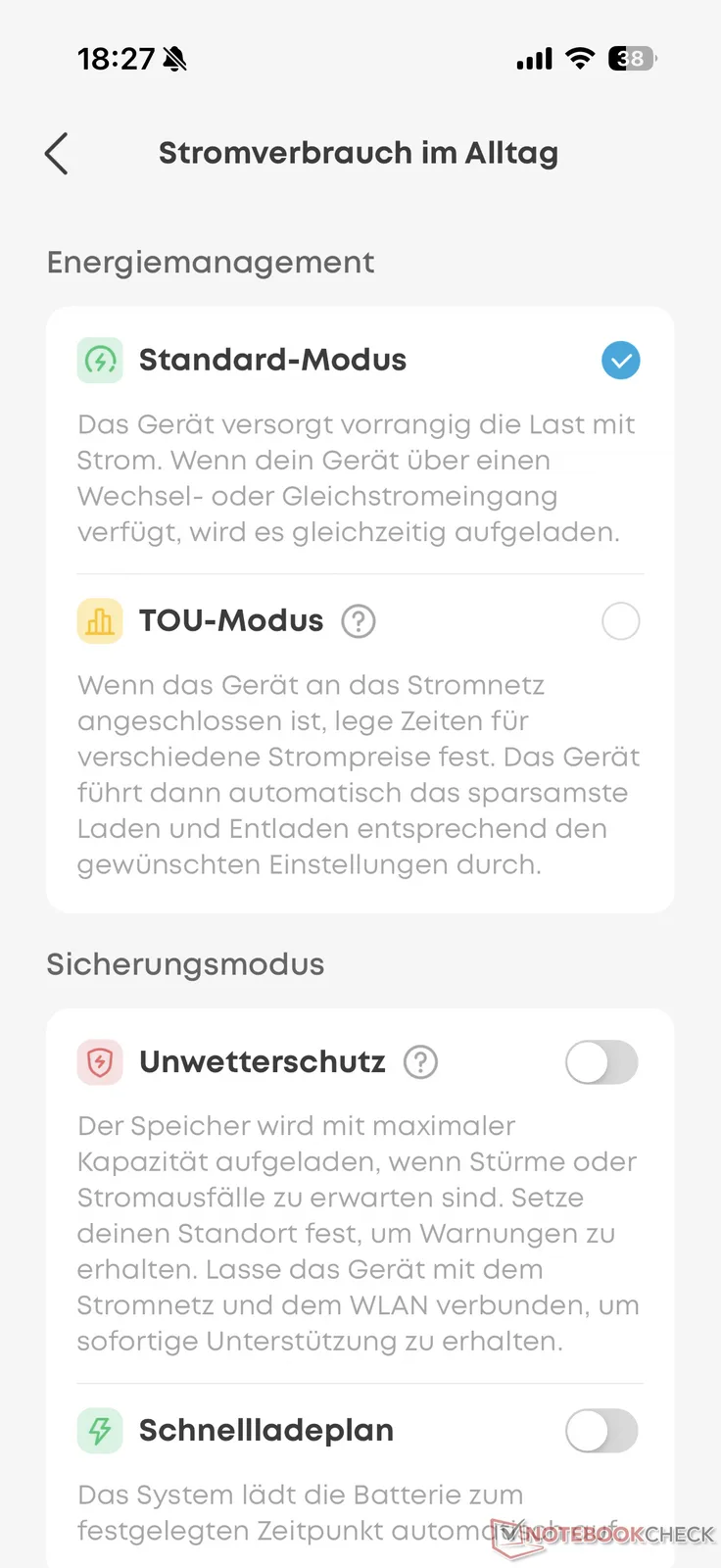 Het tot stand brengen van de verbinding verliep tijdens de test zonder problemen, zodat de installatie in een mum van tijd voltooid was. Naast het in- en uitschakelen van de verschillende aansluitingen en het display, kunt u met de Anker app ook verschillende modi selecteren. In de TOU-modus kan de centrale bijvoorbeeld automatisch worden opgeladen op gunstigere daluren. Hier is het echter alleen mogelijk om verschillende tijden op te slaan en is er geen directe verbinding met dynamische elektriciteitstarieven (zoals bij de Balkon-elektriciteitscentrales van Anker Solix).