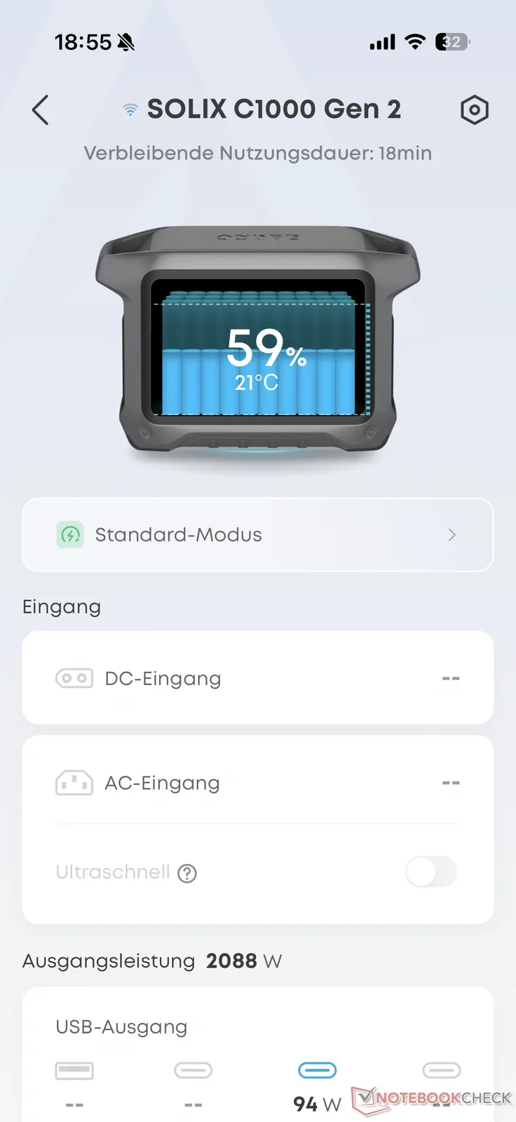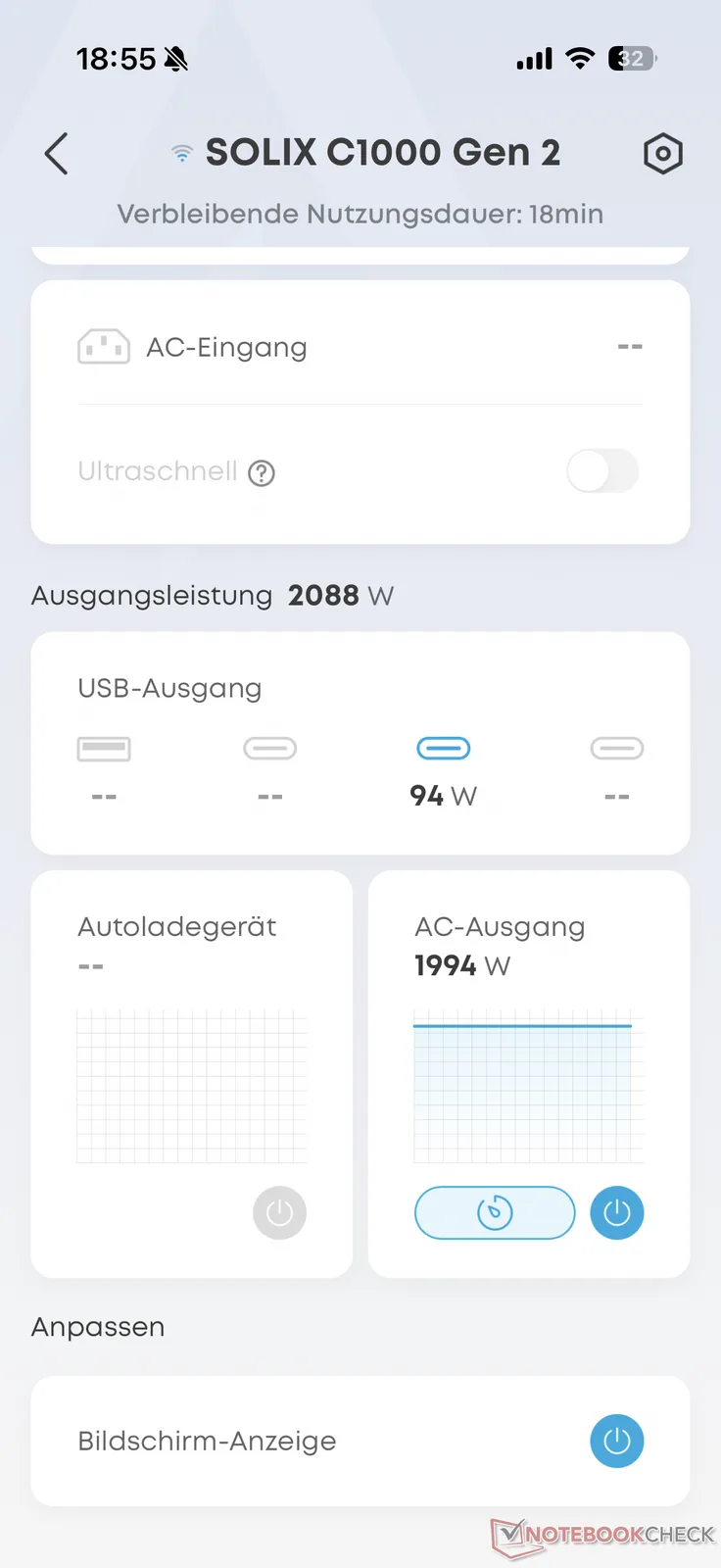Bij het testen van de Anker Solix C1000 Gen 2 haalden we niet helemaal de 49 minuten oplaadtijd die door de fabrikant wordt opgegeven voor opladen via wisselstroom - in ieder geval niet zonder de supersnelle oplaadmodus, die via de app kan worden geactiveerd. Met iets minder dan 55 minuten bleef hij echter zelfs zonder Boost ruim onder de limiet van een uur en laadde hij dus bijzonder snel op. Het was opvallend dat het laadvermogen zelfs kort voor het einde nog rond de 1.200 W lag. Dit is waar andere centrales meestal aanzienlijk vertragen.