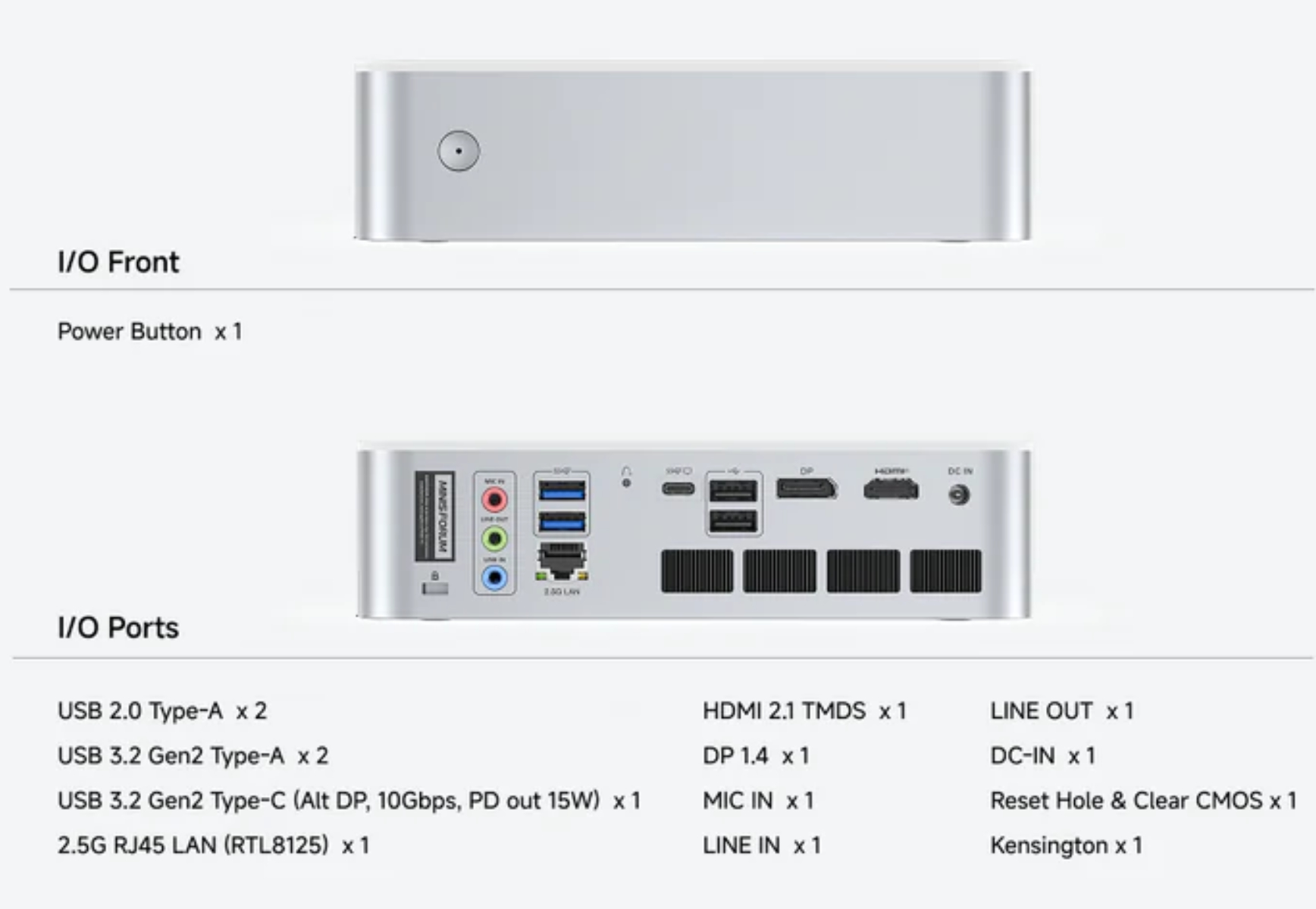 Daarnaast ondersteunt de M1-1295 Bluetooth 5.2 en Wi-Fi 6E connectiviteit via een MediaTek MT7902 M.2 2230 modem, evenals 2,5 Gigabit Ethernet via Realtek's RTL8125 controller. De mini-pc beschikt ook over een heleboel andere poorten aan de achterkant, waaronder drie video-uitgangen, zoals de afbeelding hieronder laat zien. Op dit moment zijn voorgeïnstalleerde eenheden iets goedkoper op Amazon dan op de website van Minisforum. Daarentegen verkoopt Minisforum kale units voor $329 direct op haar website. Met andere woorden, barebones units zijn ongeveer 30% goedkoper dan hun voorgeconfigureerde tegenhangers.