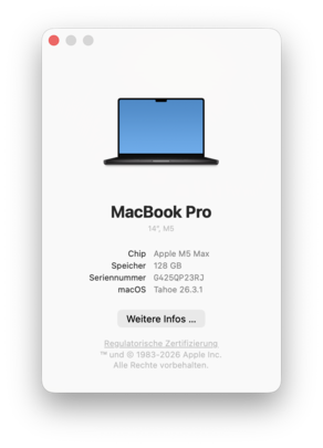 | Apple MacBook Pro 14 2026 M5 Max Apple M5 Max ⎘ Apple M5 Max 40-Core GPU ⎘ 128 GB Geheugen, 8192 GB SSD | Catalogusprijs: 8589€ | 1.6 kg | 15.5 mm | 14.20" 3024x1964 254 PPI Mini-LED | |