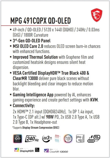 De MPG 491CQPX maakt echter gebruik van een sneller 240 Hz paneel dan de MPG 491CQPdat piekt bij 165 Hz. Bijgevolg lijkt de MPG 491CQPX dezelfde onderliggende paneeltechnologie te gebruiken als de AOC AGON PRO PD49, Philips Evnia 49M2C8900 en Samsung Odyssey OLED G93SConder andere. Houd er rekening mee dat MSI nog geen prijs of beschikbaarheid bekend heeft gemaakt. Meer specificaties van het apparaat zijn echter te zien in de onderstaande grafiek, die allemaal overeenkomen met andere recente 49-inch, 1440p en 240 Hz QD-OLED gaming monitoren.