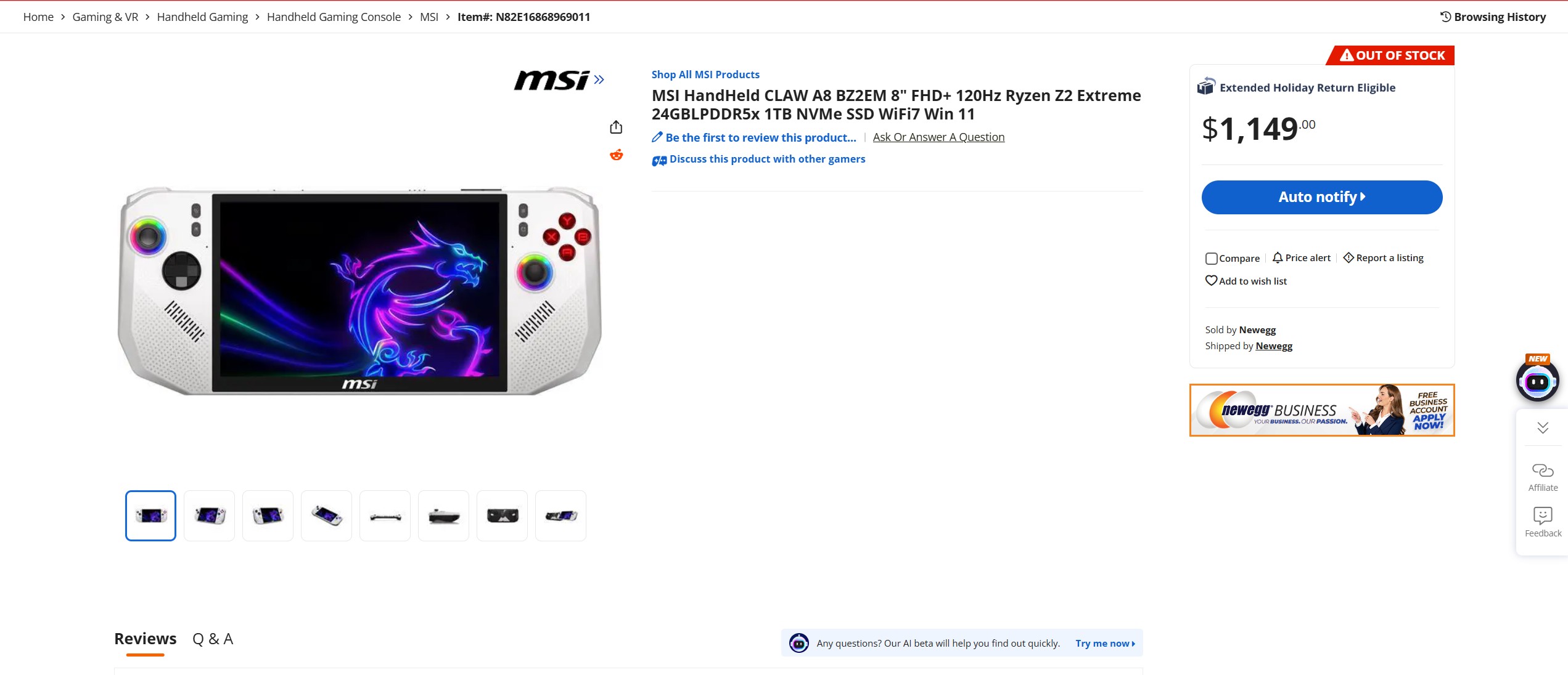 Om terug te komen op de Claw A8 op Newegg: de kernspecificaties zijn hetzelfde als de modellen die in andere regio's verkrijgbaar zijn. Dit omvat dezelfde 80 Wh batterij, 2280 M.2 SSD (1 TB Samsung SSD 9100 momenteel $175,99 op Amazon), 8 inch 120 Hz scherm met VRR, en WiFi 7. Hoewel er nog niets bekend is over wanneer hij te koop zal zijn, omdat hij al op de lijst staat, wordt verwacht dat MSI hem binnenkort officieel in de VS zal lanceren.