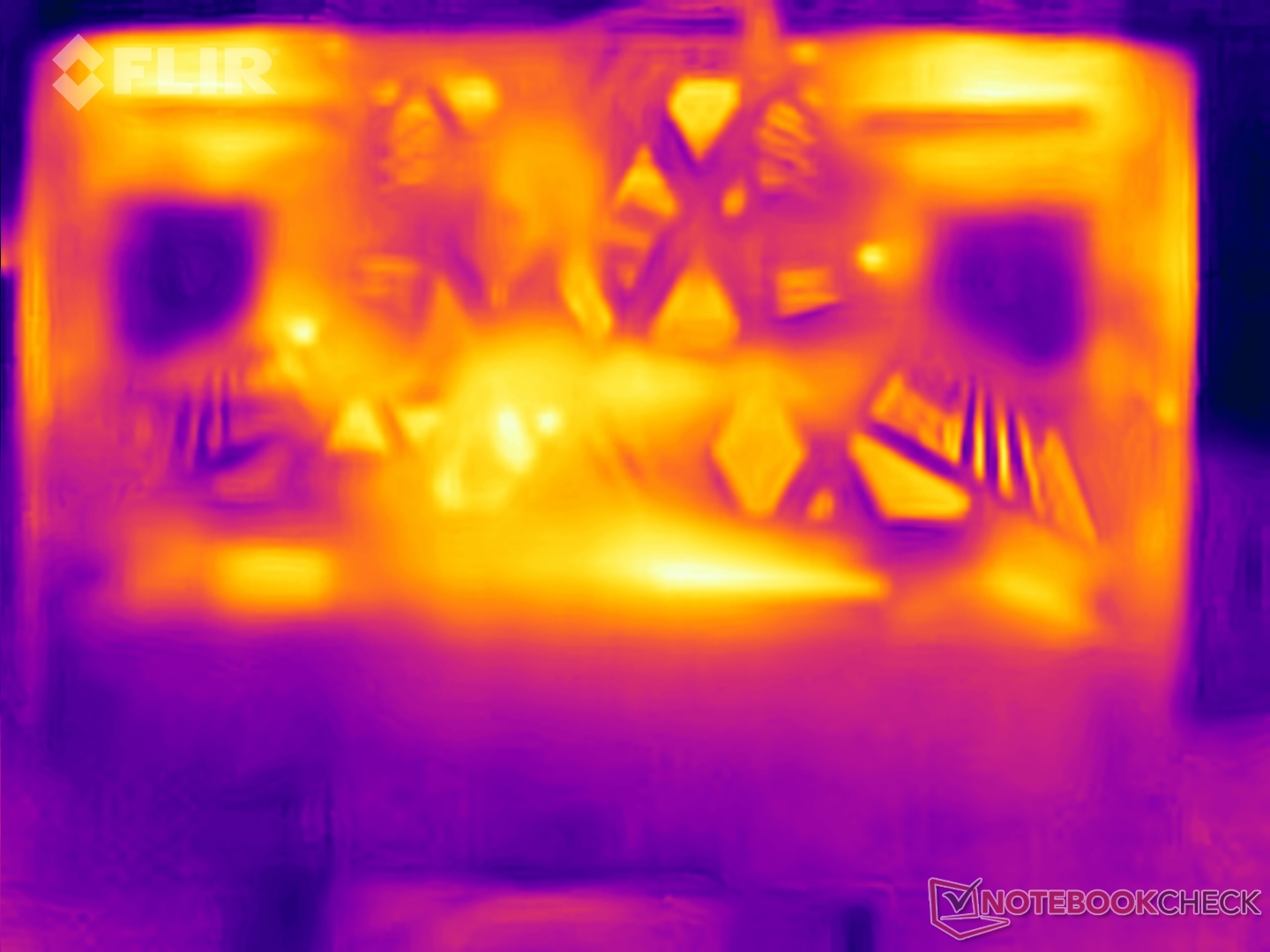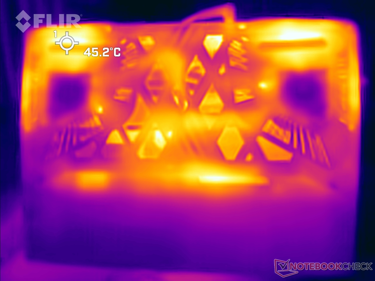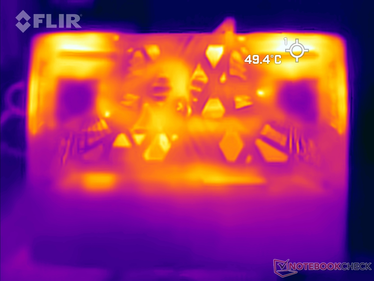 De oppervlaktetemperaturen kunnen oplopen tot 45 °C aan de bovenkant en bijna 49 °C aan de onderkant onder belasting in de modus Extreme prestaties.