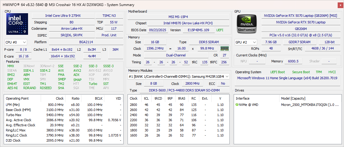 Onze Crosshair 16 HX AI is uitgerust met de Core Ultra 9 275HX en een 115 W RTX 5070 laptop GPU, samen met 16 GB DDR5-5600 geheugen, een 1 TB NVMe SSD en een QHD+ 240 Hz IPS-scherm in een vertrouwde behuizing Crosshair 16 HX D14 chassis.