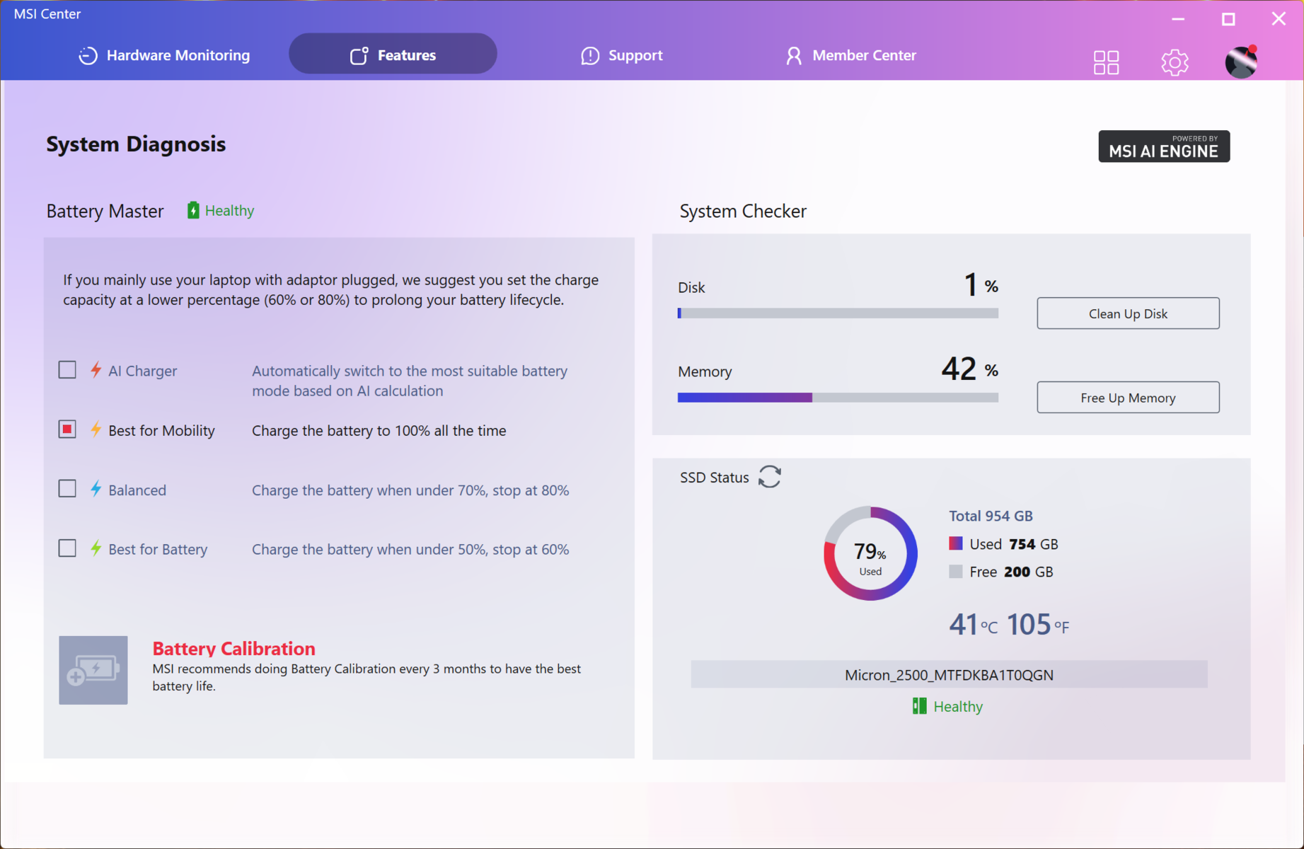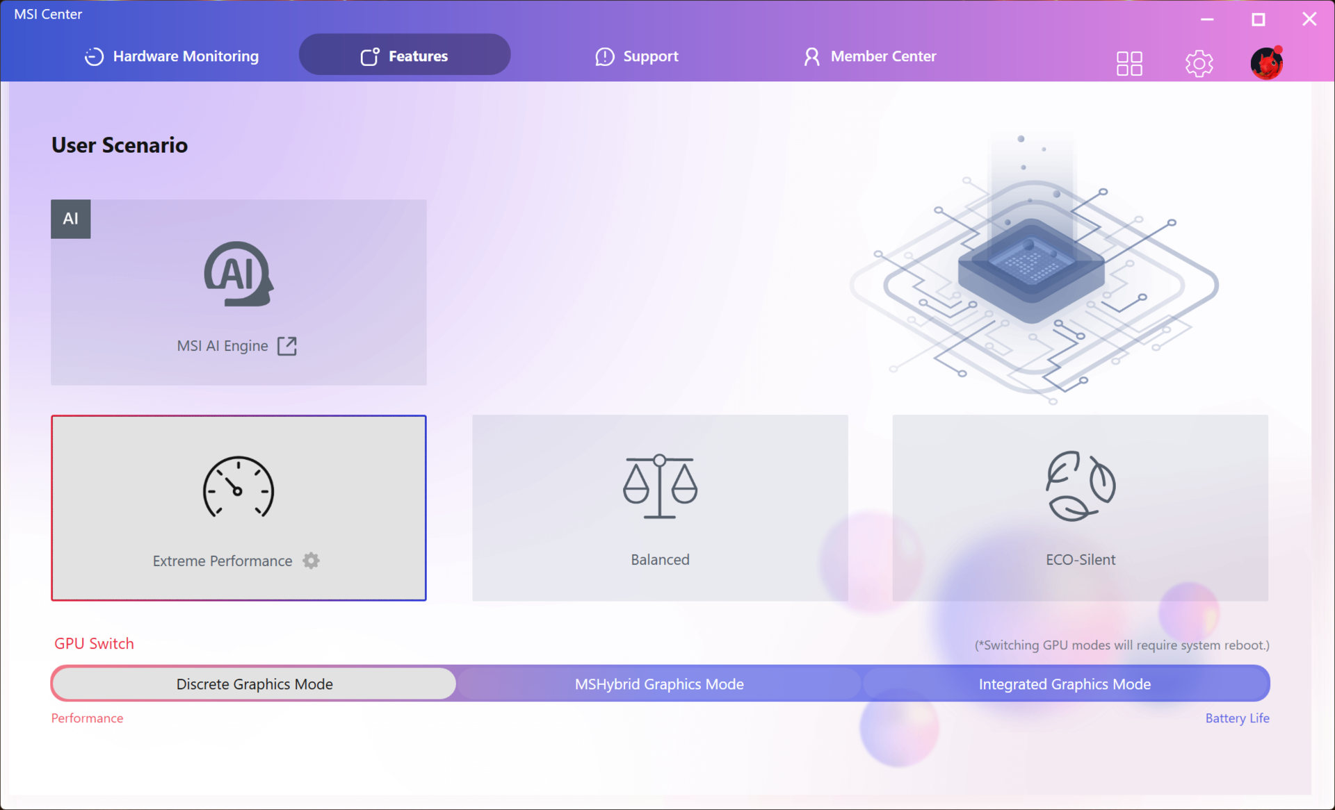 De modus Extreme prestaties ontketent het volledige potentieel van de Crosshair 16 HX AI, maar dit gaat gepaard met de vloek van meer warmte en geluid, samen met een hoger stroomverbruik.