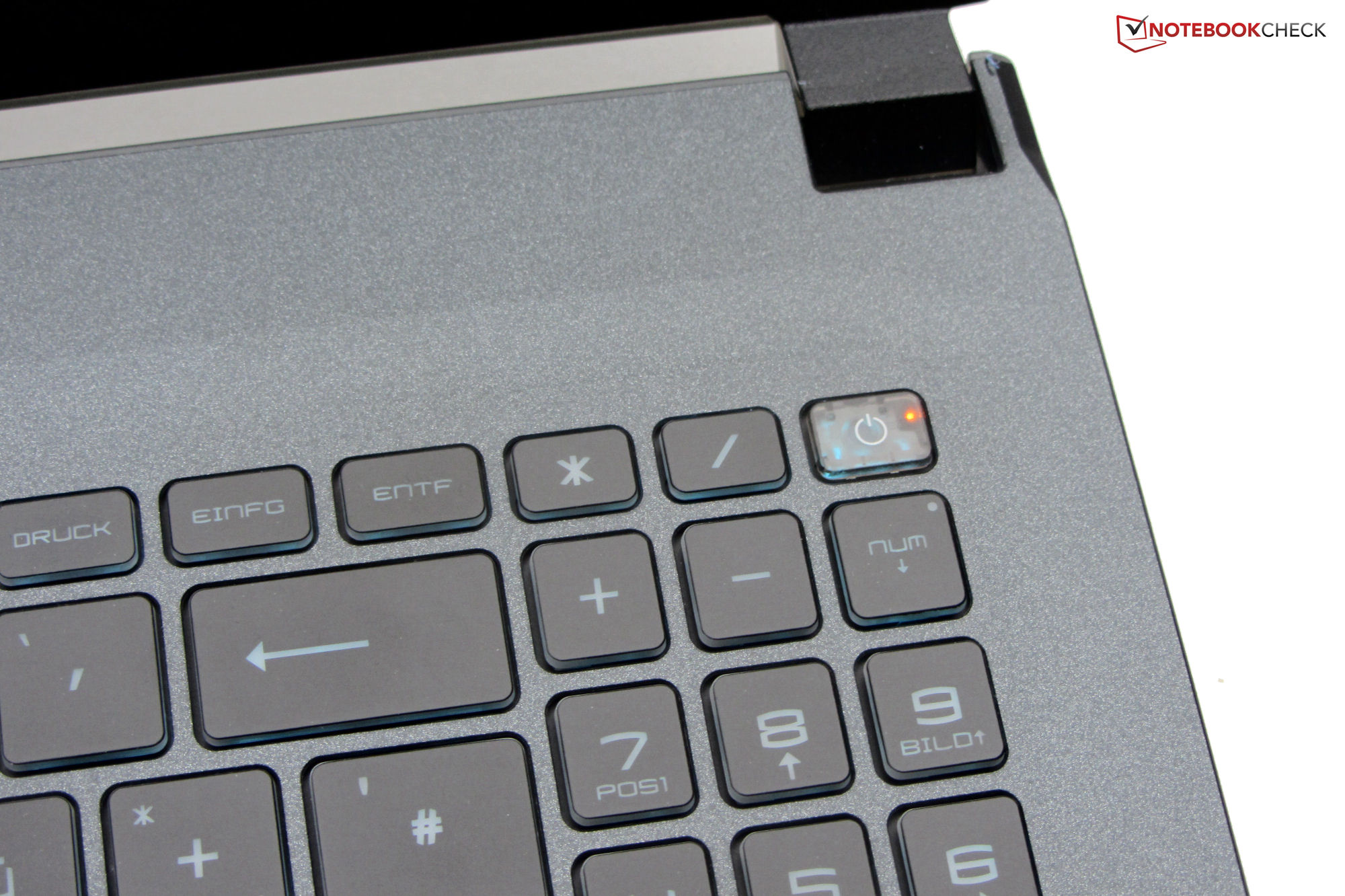 De vlakke en gladde toetsen van het verlichte chiclet-toetsenbord bieden een korte aanslag en een duidelijk drukpunt. De toetsweerstand is behoorlijk. Het toetsenbord geeft een beetje mee tijdens het typen, maar dit is niet storend. Zoals typisch voor MSI apparaten, is de "Fn" toets niet op dezelfde positie geplaatst als gebruikelijk in andere laptop toetsenborden. De eenkleurige toetsenbordverlichting biedt drie stappen van helderheid en wordt bediend via een functietoets. Over het algemeen levert MSI een toetsenbord dat geschikt is voor dagelijks gebruik.