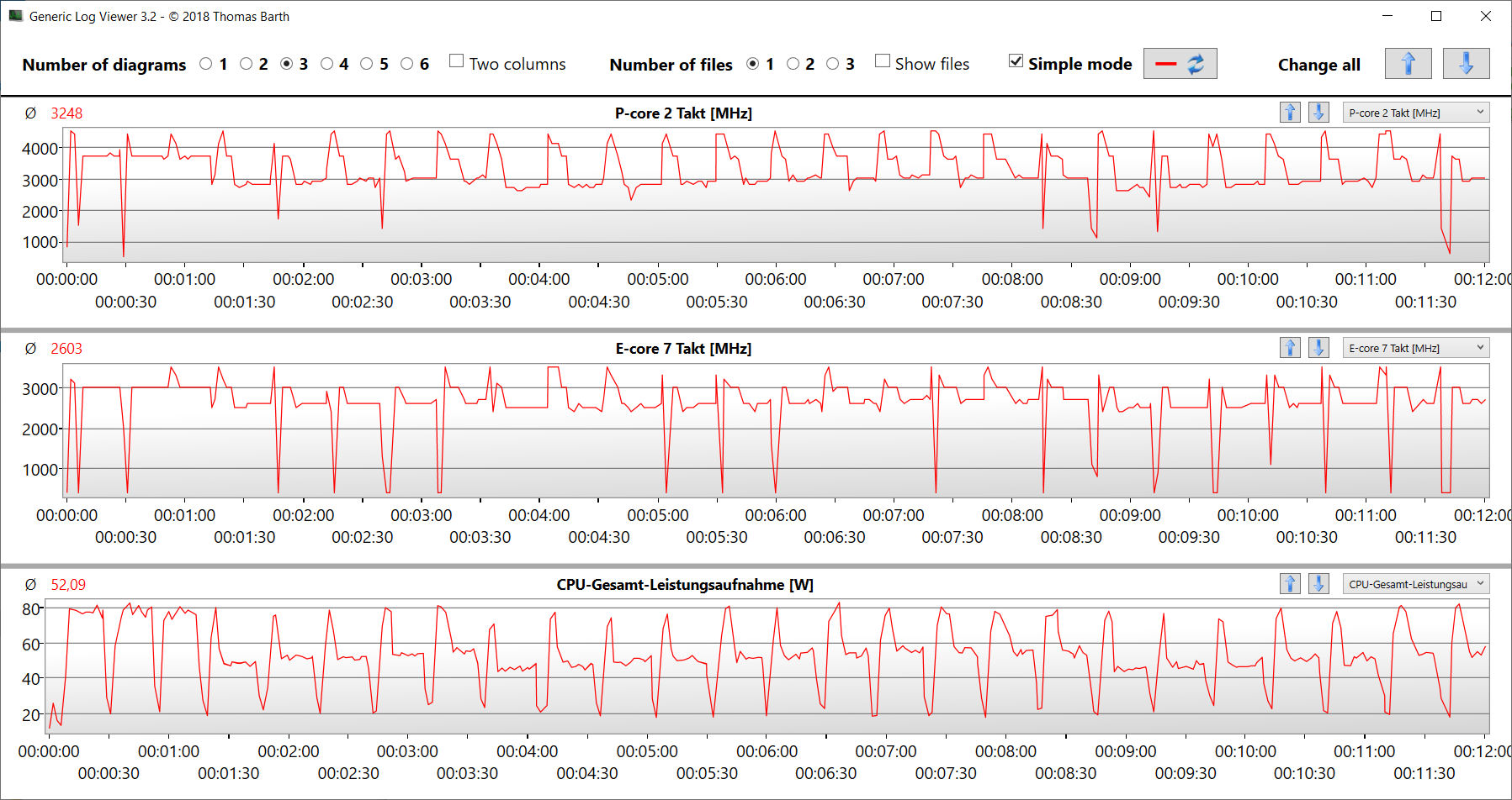 De stresstest (waarbij Prime95 en Furmark constant draaien) vormt een extreem scenario om de stabiliteit van het systeem onder volledige belasting te evalueren. De CPU (P: 3,3 tot 3,5 GHz, E: 2,8 GHz) en de GPU (1.000 tot 1.500 MHz) beginnen de test op middelhoge kloksnelheden, waarbij de waarden in de loop van de test dalen.