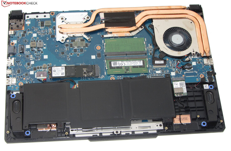 Nadat alle schroeven aan de onderkant zijn verwijderd, kan de bodem van de behuizing worden verwijderd met behulp van een klein wrikgereedschap of een spatel. Maar je moet voorzichtig zijn, want hij wordt vastgehouden door vrij strakke plastic clips. Na het verwijderen van de bodem krijg je toegang tot de werkgeheugenbanken (beide bezet), SSD (PCIe 4), BIOS batterij, WLAN module, ventilator, luidsprekers en batterij.