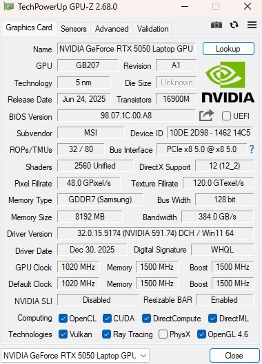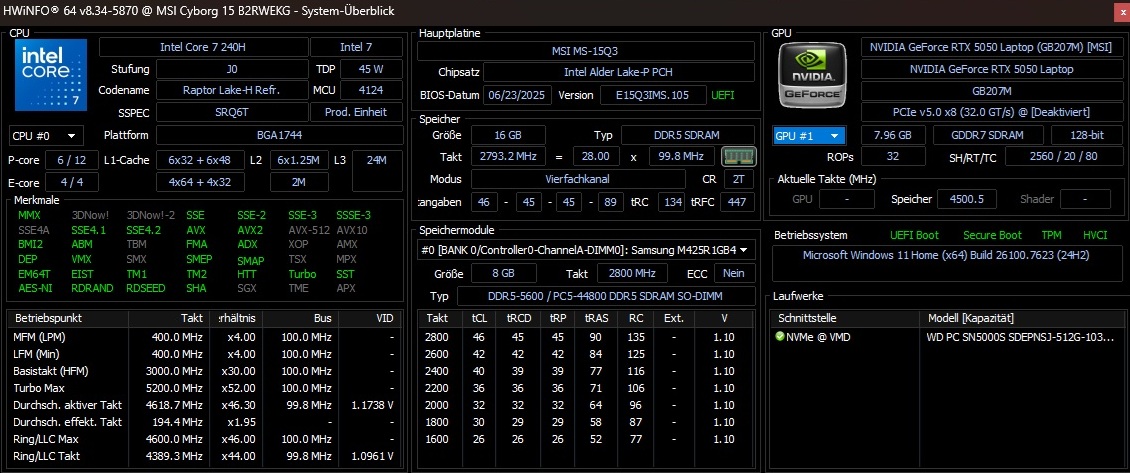 Het vermogen van de grafische kaart is ook het bespreken waard: Aangezien MSI de RTX 5050 slechts een magere 45 watt TGP geeft, schieten de GPU-prestaties tekort, zoals we in de loop van het artikel zullen laten zien. De rest van de uitrusting is degelijk, maar niet overdadig voor de prijs, met een Core 7 240H, 16 GB DDR5 RAM (2x 8 GB) en een 512 GB SSD. Ondertussen zijn er pluspunten voor de privacy shutter van de webcam, wat niet vanzelfsprekend is voor gaming laptops in het bijzonder.