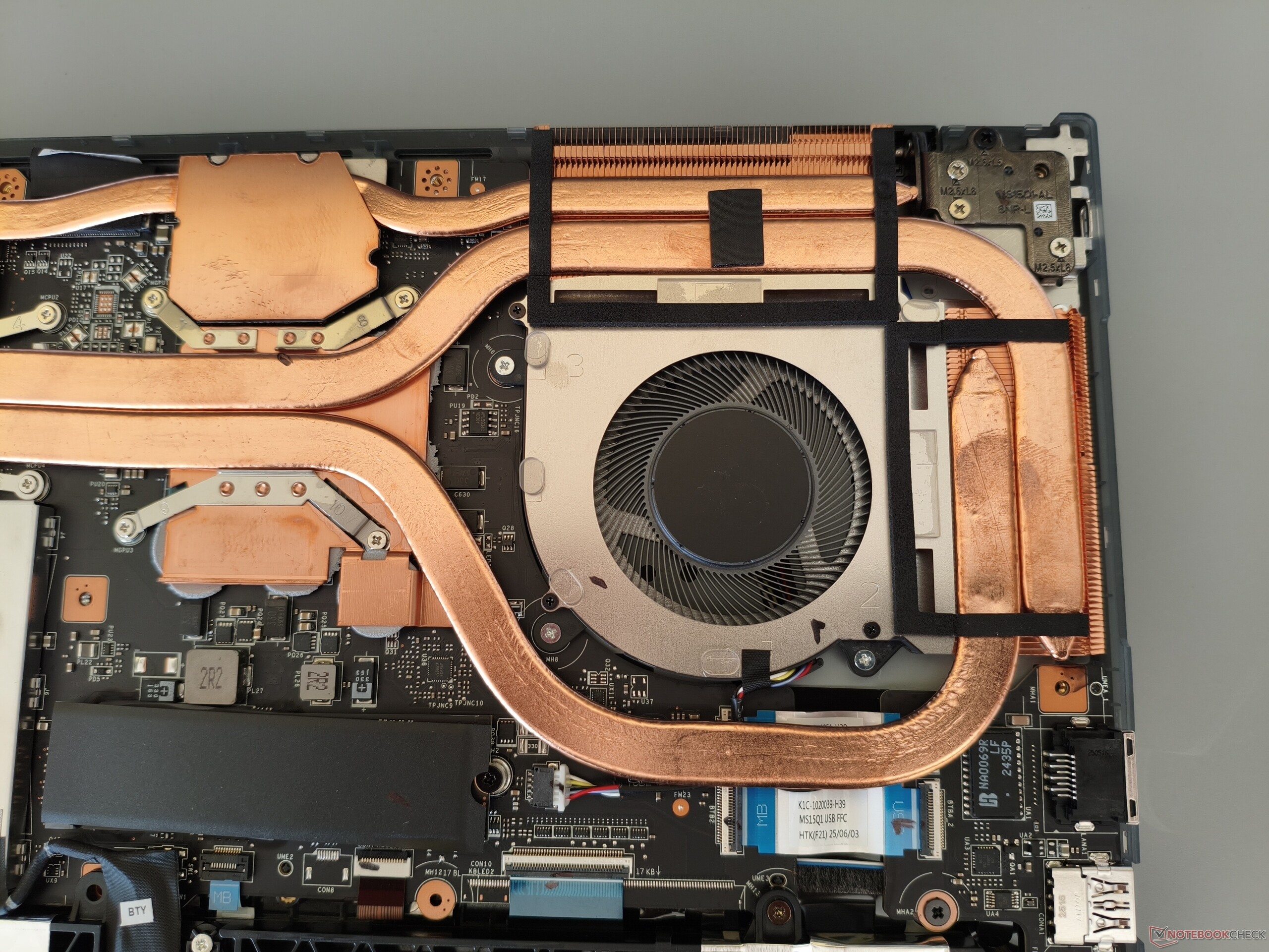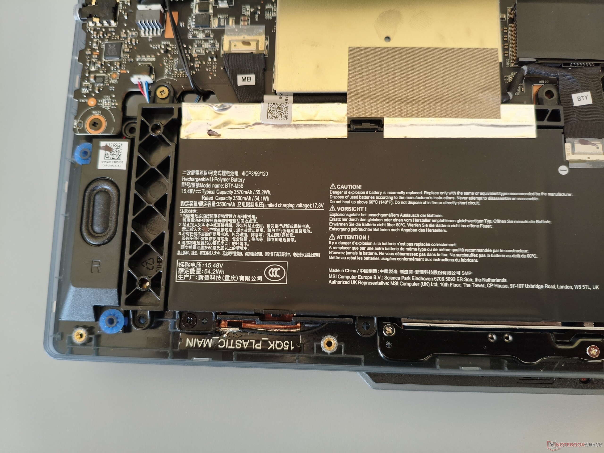 Voor de behuizing is een combinatie van metaal (deksel) en kunststof (onderkast) gebruikt. Voor het grootste deel geven vakmanschap en stabiliteit geen reden tot kritiek. MSI verdient vooral lof voor de royale openingshoek van 180°. Met een gewicht van iets minder dan 2,2 kg (~4,9 lbs) zit de Cyborg 15 comfortabel in het midden van de concurrentie, die tussen de 1,9 en 2,4 kg (~4,2 en 5,3 lbs) weegt. Om de behuizing te openen, moeten er 12 kruiskopschroeven worden verwijderd. Hoe het er onder de motorkap uitziet, kunt u zien op de foto's hieronder.