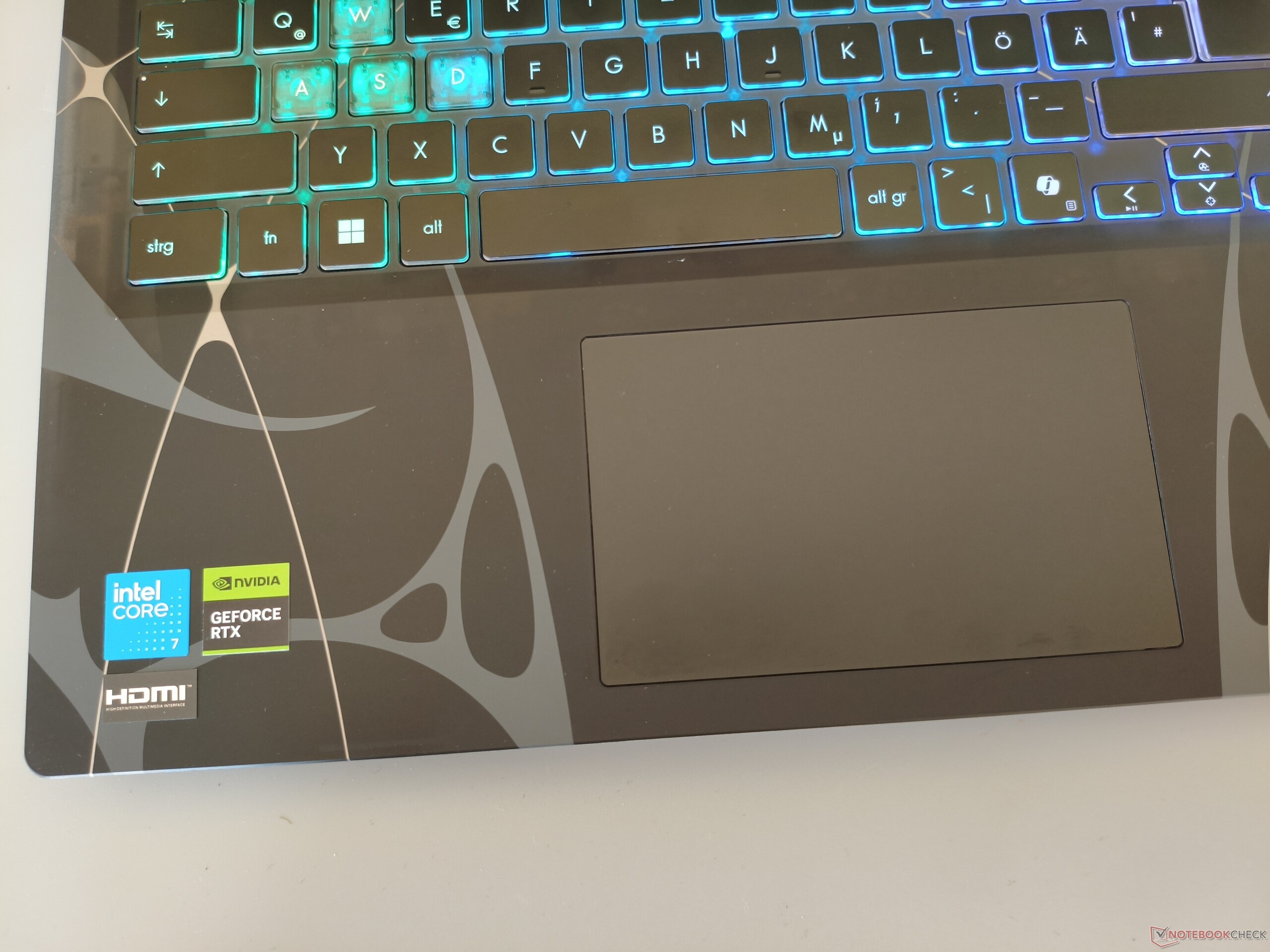 Het toetsenbord vereist enige gewenning vanwege de eigenzinnige lay-out die typisch is voor MSI. Het feit dat het numerieke toetsenbord maar drie in plaats van vier kolommen heeft, is ook even wennen. Wij zouden het typegevoel zelf als solide omschrijven. Gamers kunnen zich ook verheugen op relatief krachtige RGB-verlichting. Het touchpad meet 12 x 7,6 cm (~4,7 x 3,0 in), wat meer dan voldoende is voor een 15-inch apparaat. De muisvervanger presteert in de test op een bevredigend niveau wat betreft precisie, glij-eigenschappen en gebaren.