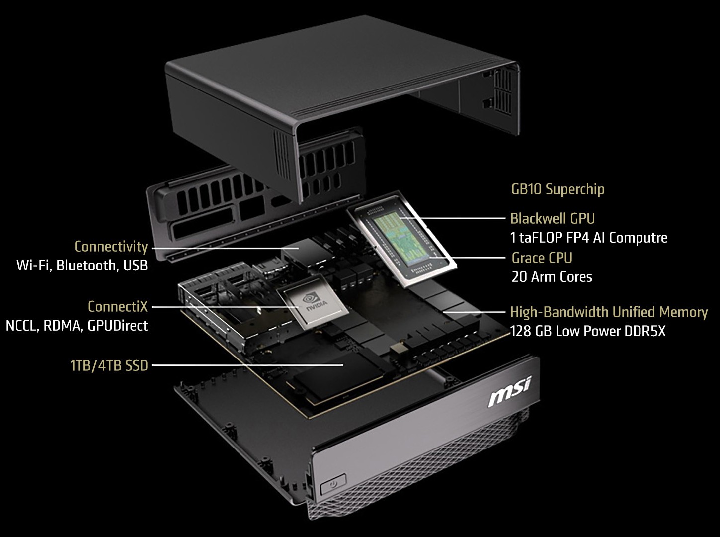 De specificaties van de 99SUS 1 TB zijn in wezen hetzelfde als die van de originele MS-C931, behalve dat de Bluetooth-versie werd afgewaardeerd van 5.4 naar 5.3. Verder wordt hij aangedreven door de GB10 superchip met een Blackwell GPU die 1 PetaFLOP FP4 AI-instructies kan verwerken, plus een Grace CPU met 10 ARM Cortex-X925 kernen en 10 ARM Cortex-A725 kernen. De superchip wordt aangevuld met 128 GB LPDDR5X unified systeemgeheugen met 273 GB/s bandbreedte. De CPU en GPU hebben beide toegang tot de LPDDR5X RAM pool via een NVLink C2C interconnect die 5x PCIe 5.0 bandbreedte biedt. Voor wat betreft de opslag biedt MSI 1 of 4 TB NVMe SSD opties. De behuizing meet 151 x 151 x 52 mm (1,19 liter volume) en weegt 1,2 kg.