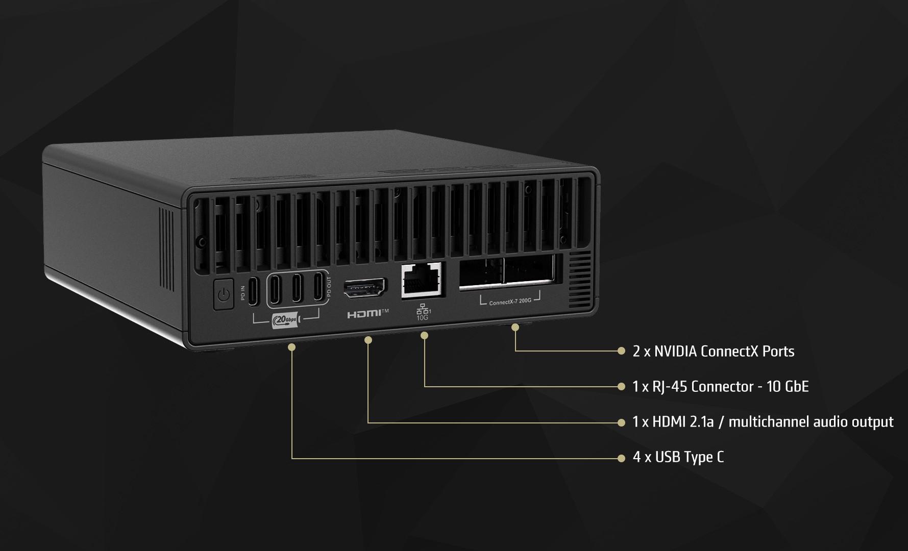 De poortenselectie omvat 4X USB-C 3.2 20 Gbps poorten met PD-functionaliteit, een HDMI 2.1a video-uitgang met meerkanaals audio-uitvoer, een 10 GbE NIC en 2x Nvidia ConnectX-7. Draadloze connectiviteit is verzekerd via een Wi-Fi 7 + BT 5.3 kaart.