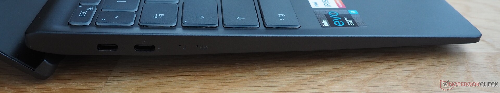 Wat de havens betreft, volgt MSI de "Apple trend" en rust de 14 Evo uit met slechts een handvol havens. Naast twee moderne Thunderbolt 4 poorten aan de linkerzijde die ook worden gebruikt om de laptop op te laden, heeft de 14-inch ook een USB 2.0 Type-A-poort, een microSD-slot en een 3,5 mm audio-aansluiting voor koptelefoon en microfoons aan de rechterzijde. Kopers zullen het moeten doen zonder een RJ45-poort en een Kensington-slot en speciale video-uitgangen. Externe monitoren worden op de Thunderbolt-poorten aangesloten via een DisplayPort/HDMI naar USB-C-adapter en de bijbehorende kabel