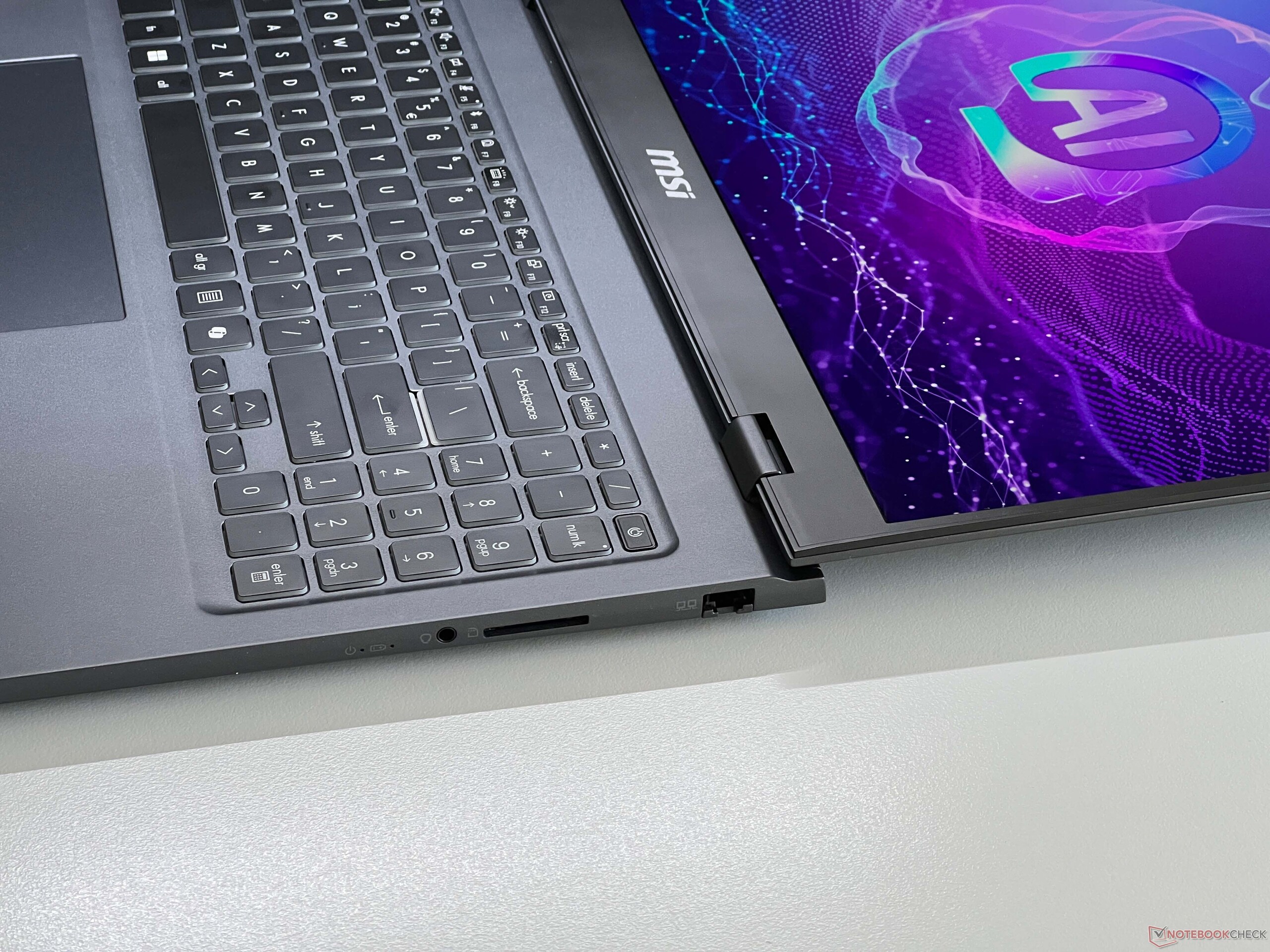 Over het algemeen beschikt de Prestige over alle belangrijke poorten, waaronder USB-C, USB-A, Gigabit Ethernet en een SD-kaartlezer. We zijn echter helemaal niet tevreden over de verdeling ervan, omdat alle USB-poorten zich aan de achterkant van het apparaat bevinden. Er is geen enkele poort aan de linkerkant, wat te wijten is aan de interne indeling van de laptop. Dit is gewoon ongelooflijk onpraktisch tijdens dagelijks gebruik en we begrijpen deze beslissing dan ook totaal niet. De NPU van de nieuwe Arrow Lake processors voldoet niet aan de minimumvereisten voor een Copilot+ PC, maar functies zoals Studio Effects of live ondertiteling worden nog steeds ondersteund.