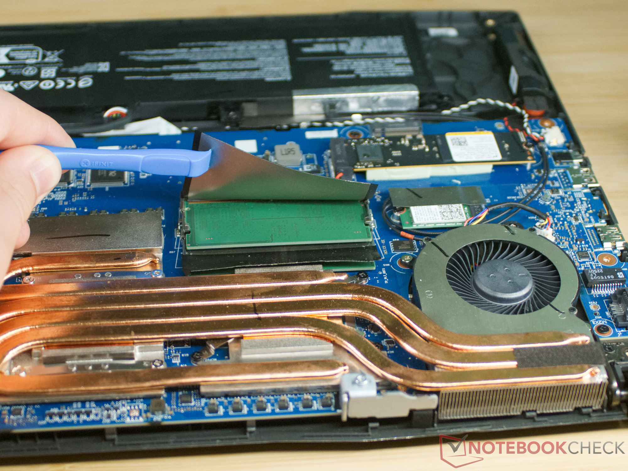 De laptop biedt ook een tweede M.2 PCIe slot, maar dat wordt helaas geblokkeerd door de batterij. Je kunt dus waarschijnlijk alleen een tweede SSD installeren met een oplossing met adapters en kabels.