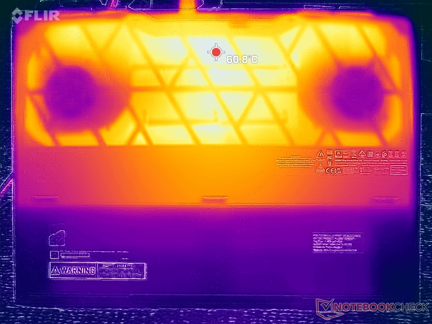 De oppervlaktetemperaturen zijn warmer dan verwacht, zelfs in vergelijking met andere 18-inch gaming laptops. Bij het uitvoeren van Cyberpunk 2077, bijvoorbeeld, bereikten de hete plekken aan de boven- en onderkant elk meer dan 50 C in vergelijking met de lagere 40 C op de Blade 18 onder vergelijkbare omstandigheden. Vooral de palmsteunen zijn tijdens het gamen merkbaar erg warm aan de handen of vingers.