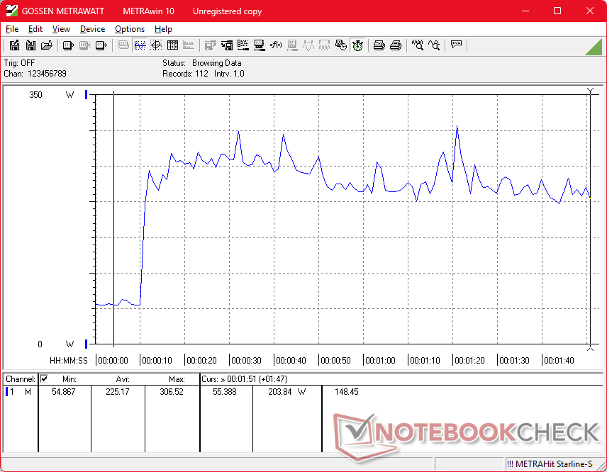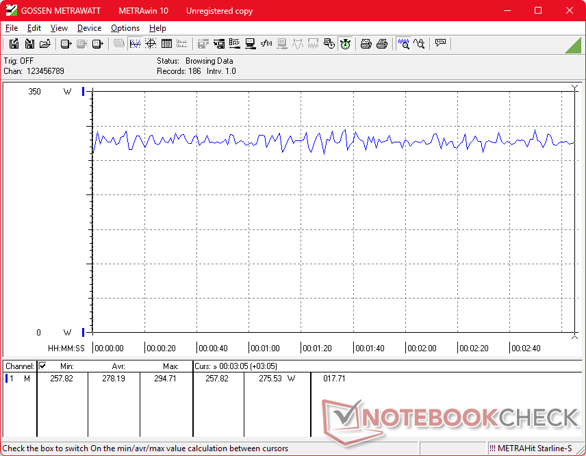 Het systeem wordt geleverd met een middelgrote (~16,5 x 7,5 x 2,5 cm) 280 W wisselstroomadapter, die waarschijnlijk te klein is voor zo'n veeleisende machine. De Lenovo Legion 9 18 of Blade 18 met dezelfde CPU en GPU worden bijvoorbeeld elk geleverd met een 330 W AC-adapter ter vergelijking. Bovendien kan de MSI maar liefst 278 W gebruiken tijdens het gamen of zelfs meer dan 300 W van de meegeleverde 280 W AC-adapter, wat bewijst dat het systeem baat had kunnen hebben bij een grotere PSU. Oplaadsnelheden zijn vervolgens erg traag tijdens het gamen of het gelijktijdig uitvoeren van andere veeleisende belastingen.