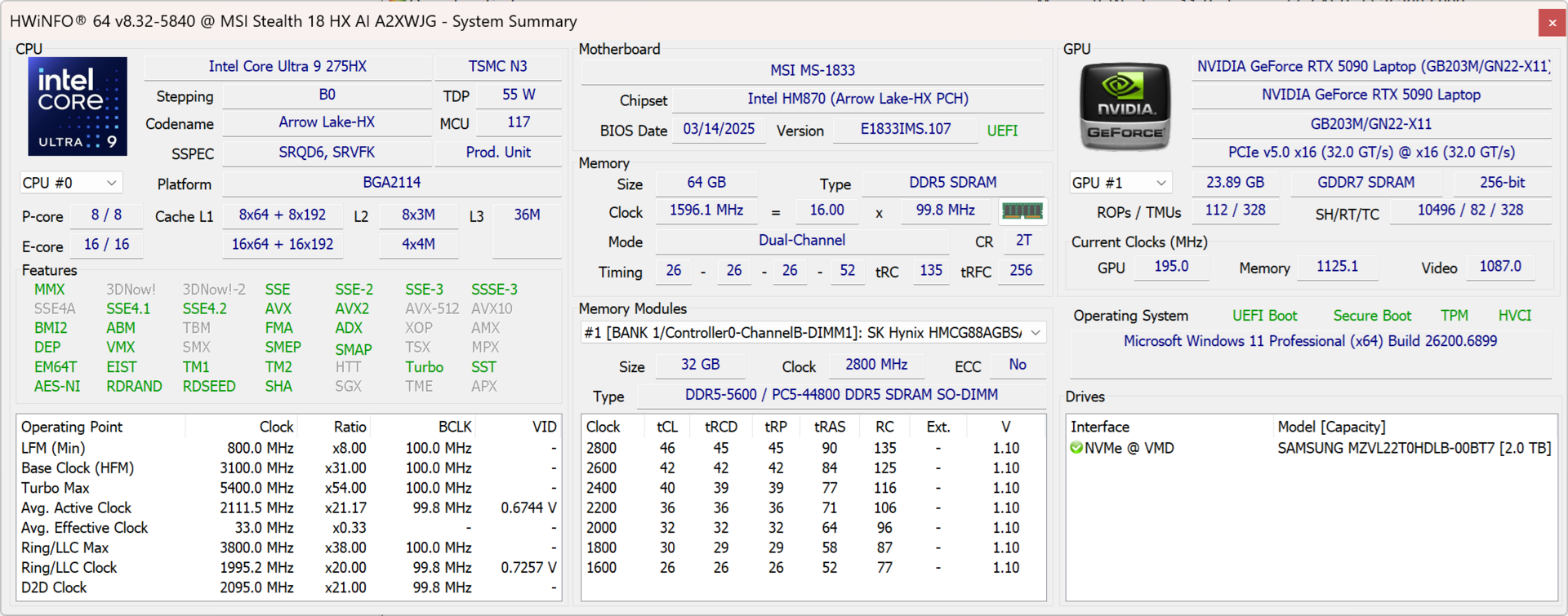 | MSI Stealth 18 HX AI A2XW Intel Core Ultra 9 275HX ⎘ NVIDIA GeForce RTX 5090 Laptop ⎘ 64 GB Geheugen, 2048 GB SSD | Amazon: $4,375.00 Catalogusprijs: 4000 USD | 3 kg | 23.99 mm | 18.00" 3840x2400 252 PPI Mini-LED | |
