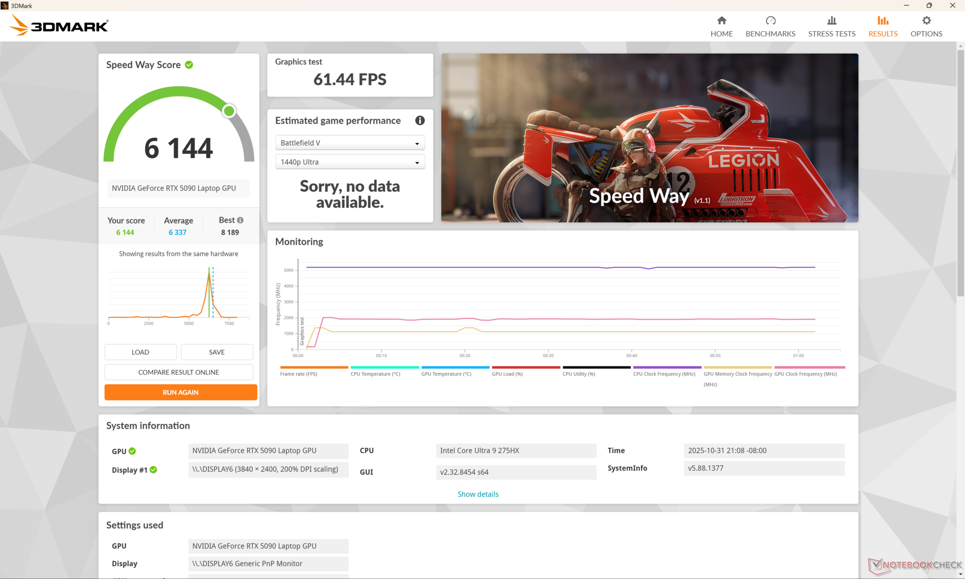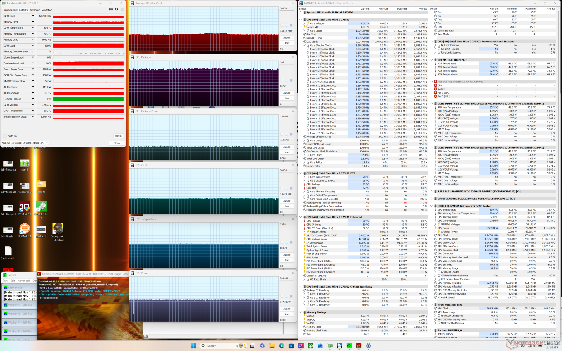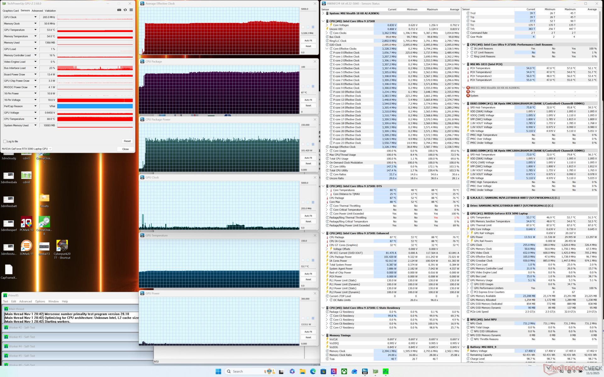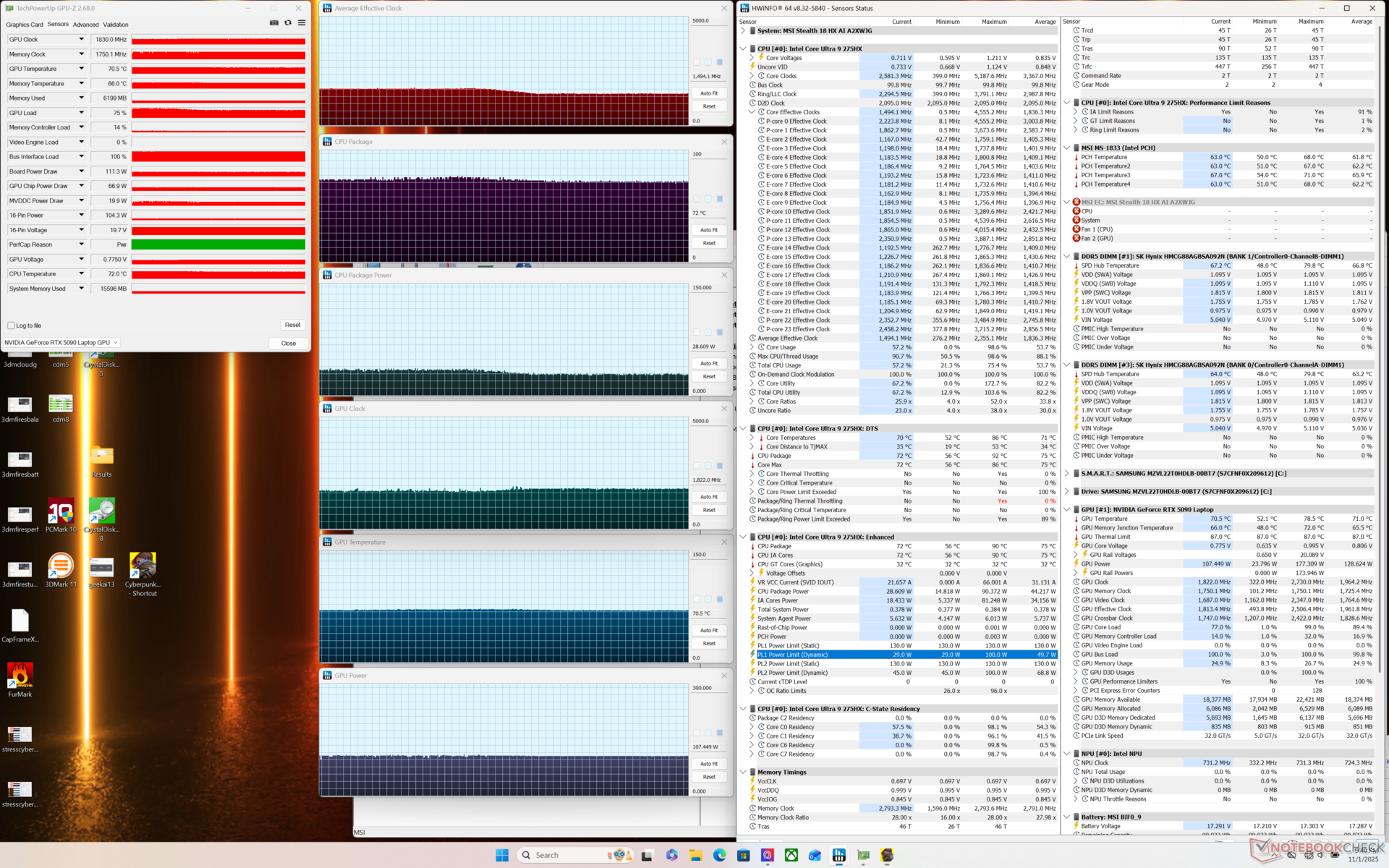 Het uitvoeren van Cyberpunk 2077 zou 18 procent minder stroom verbruiken dan de Razer Blade 18 met dezelfde CPU en GPU. De prestaties zouden echter ook iets langzamer zijn met de MSI, zoals hierboven vermeld in het gedeelte over GPU-prestaties.