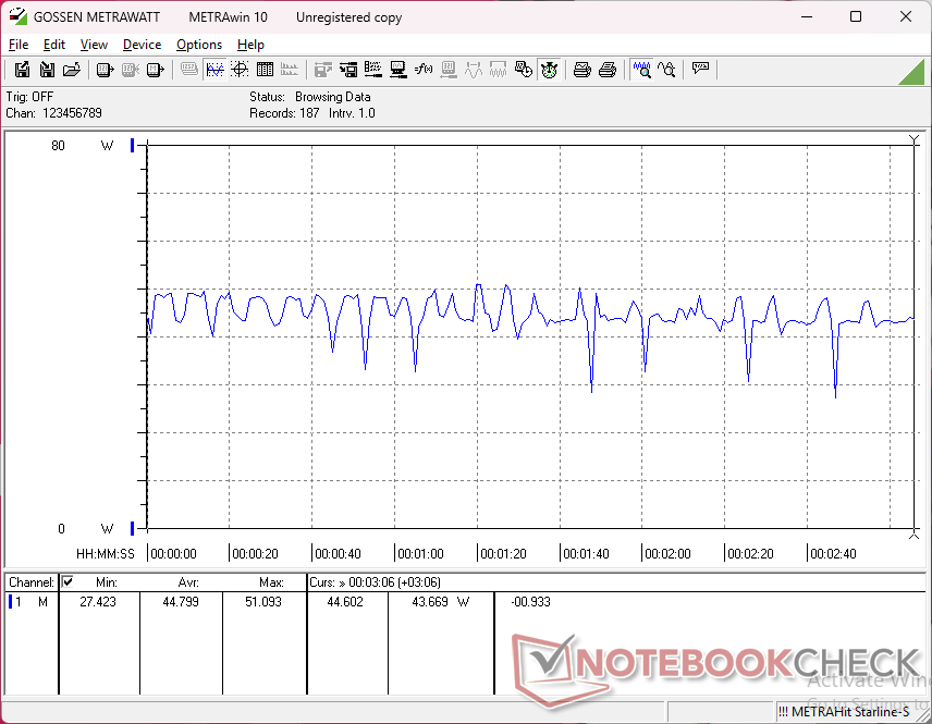 Het stroomverbruik kan onregelmatig zijn bij veeleisende GPU-belastingen zoals Cyberpunk 2077 , wat overeenkomt met de framerate stotteringen die hierboven zijn vermeld. Dit in tegenstelling tot het Framework 13.5 die geleverd wordt met exact dezelfde Core Ultra 7 155H CPU, maar met een veel gelijkmatiger verbruik onder belasting.