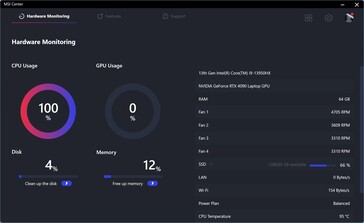 CPU en GPU vlakken snel af bij respectievelijk 75W en 150W tijdens de stresstest en de prestaties zijn stabiel. Het systeem koelt in totaal 225W, maar MSI adverteert zelfs tot 250W voor systemen met deCore i9-13980HX, dus de temperaturen zouden wel eens wat hoger kunnen zijn (we verwachten niet echt nog hardere ventilatoren).
