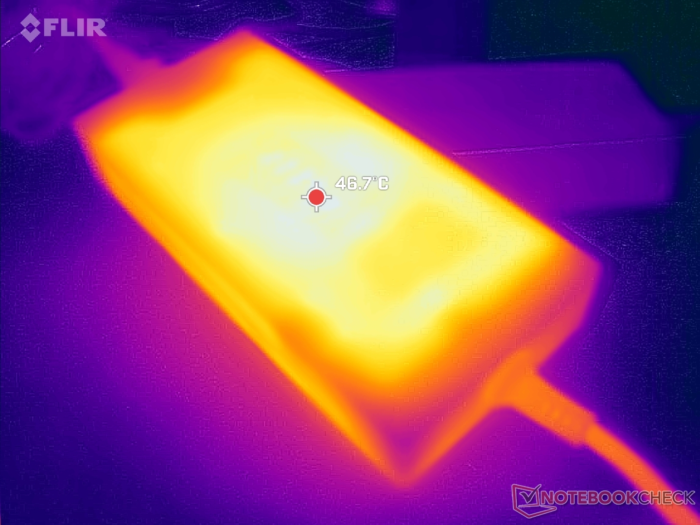 De oppervlaktetemperaturen zijn koeler dan die van de meeste andere gaming laptops dankzij de plastic voet, de ruime ventilatieroosters en het dikke chassisontwerp. Dit is zelfs een van de koelste gaminglaptops die we hebben getest met een RTX 4080. Wanneer u Witcher 3bereikt de hot spot op het midden van het toetsenbord slechts 34 C, vergeleken met 39 C op de Legion 5i 16 G9 of oudere Vector GP66.
