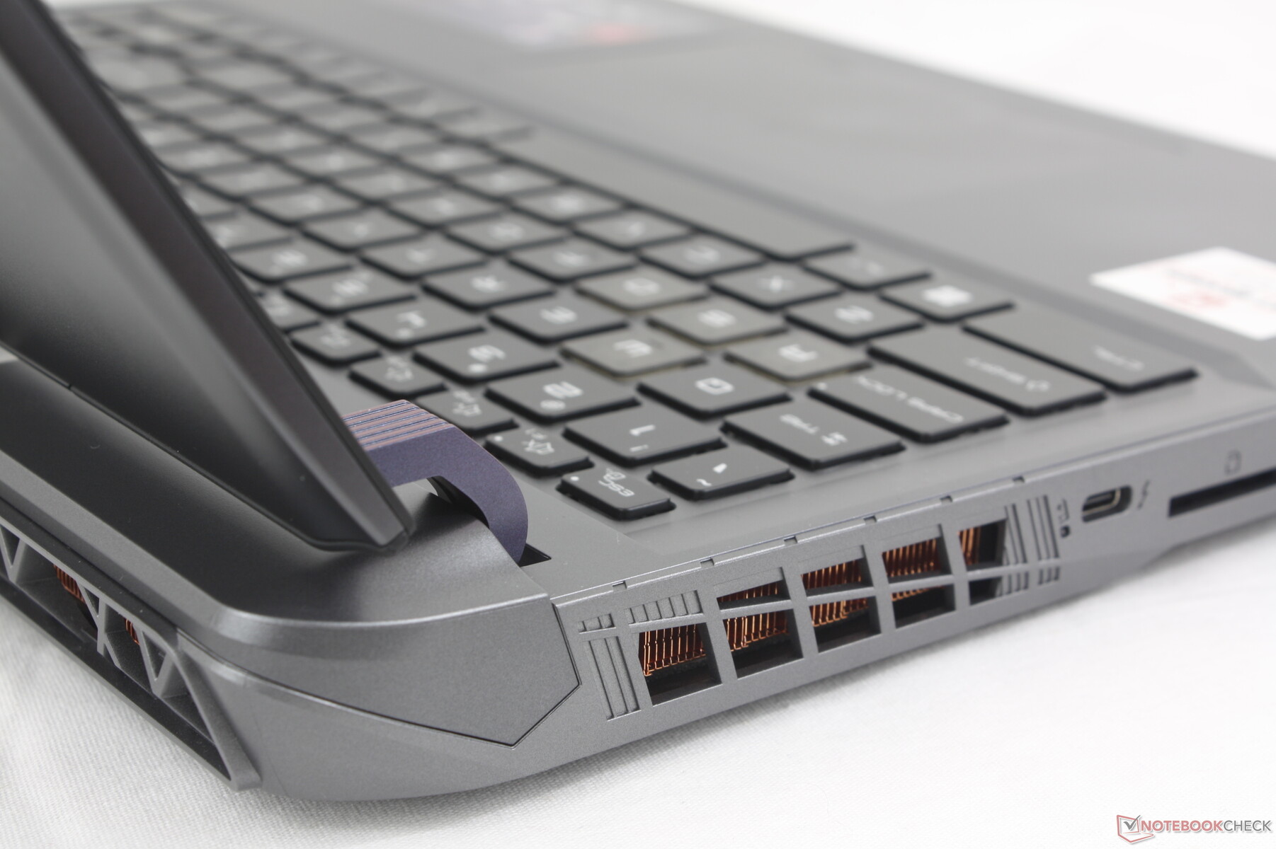 Gelukkig is de stevigheid van het chassis van boven tot onder uitstekend, inclusief het deksel, waar deze op andere laptops merkbaar zwakker is. Met name de opnieuw ontworpen scharnieren zijn nu veel groter en steviger dan voorheen en doen denken aan de scharnieren op de Asus Strix Scar 17. Hun kromming beperkt echter de maximale hoek waarin u het scherm kunt openen tot slechts 130 graden.
