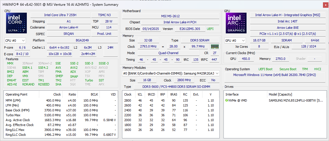 | MSI Venture 16 AI A2HMTG Intel Core Ultra 7 255H ⎘ Intel Arc Graphics 140T ⎘ 32 GB Geheugen | Amazon: Catalogusprijs: 1000 USD | 2.1 kg | 23.15 mm | 16.00" 1920x1200 142 PPI IPS | |