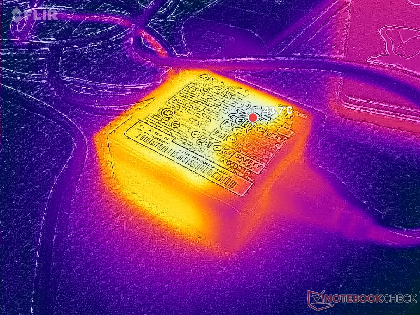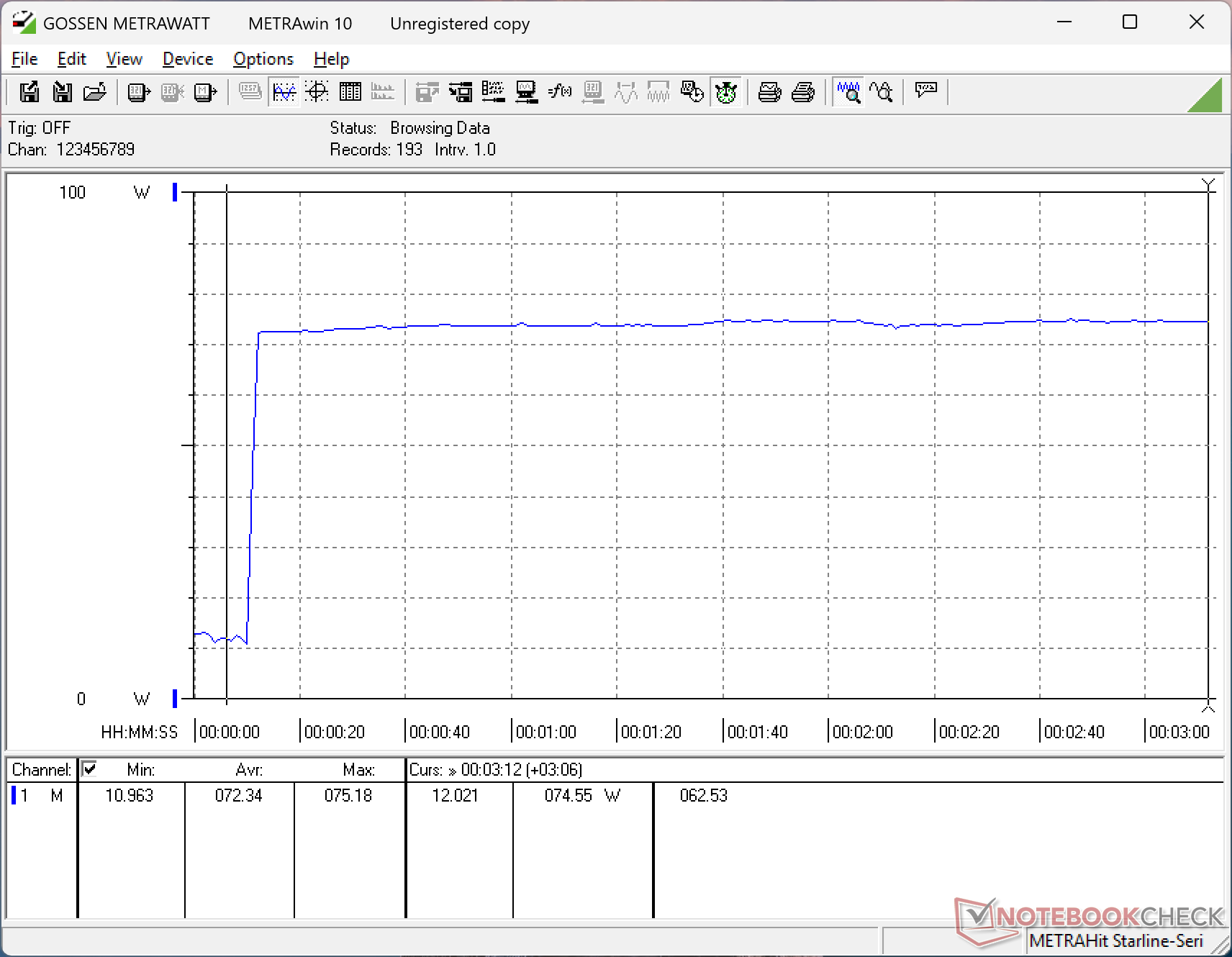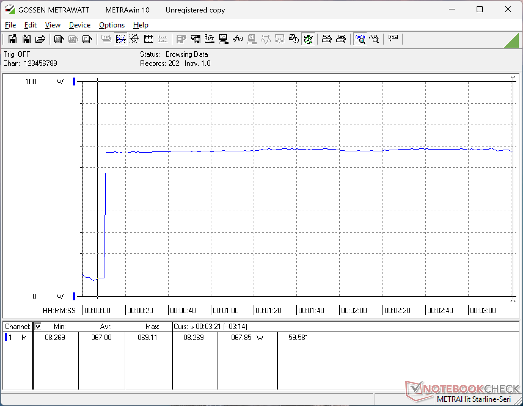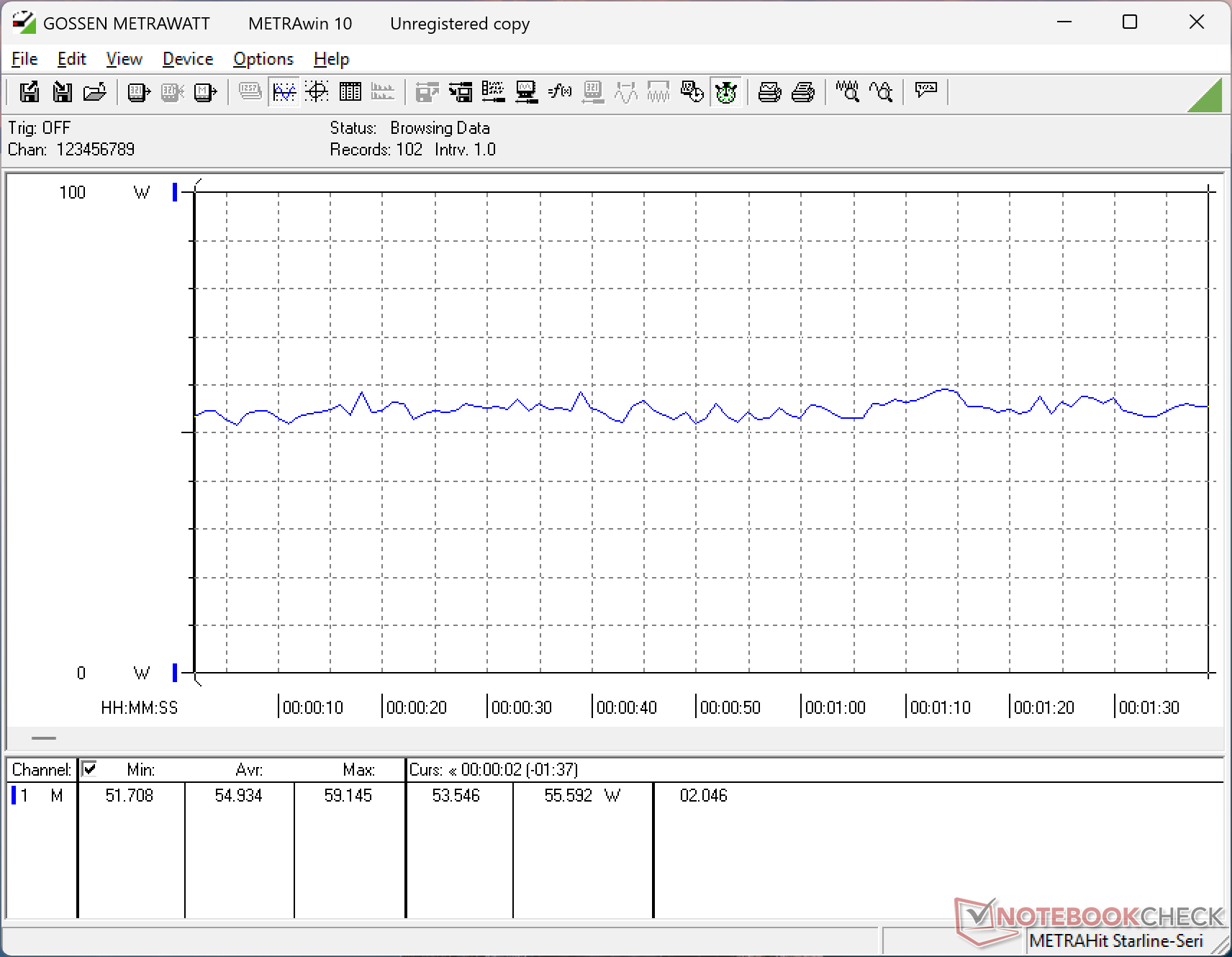 Het totale verbruik is over het algemeen hoger dan dat van veel andere budgetgerichte 16-inch laptops, grotendeels dankzij de snellere Core-H serie CPU. Het uitvoeren van Prime95 zou bijvoorbeeld bijna 70 W vergen, vergeleken met slechts 40 W op de Lunar Lake-V-aangedreven Dell 16 Plus.