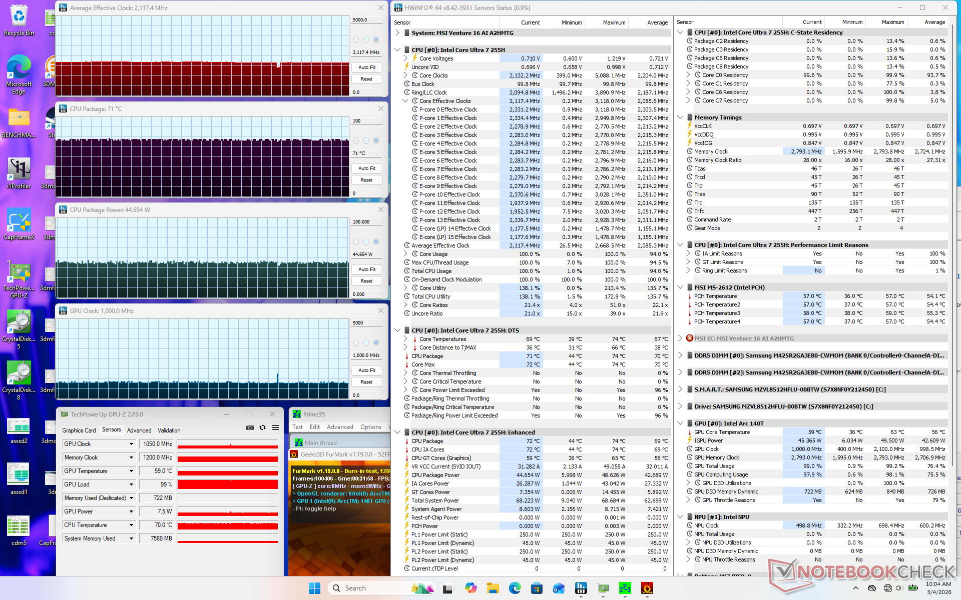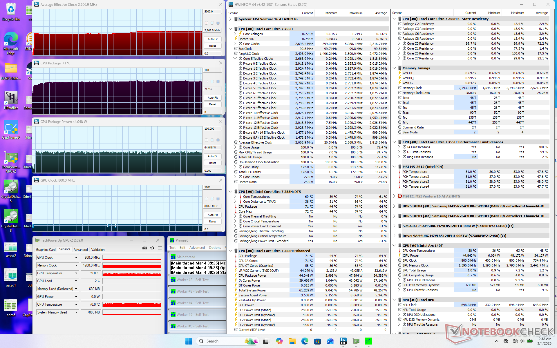 De CPU stabiliseerde zich op 2,7 GHz, 71 C en 44 W bij het starten van Prime95 belasting. De kerntemperatuur bleef in het lage 70 C-bereik, zelfs onder belasting, vergeleken met het midden van 80 C-bereik op de Prestige 16 met een vergelijkbare Core H-serie CPU.