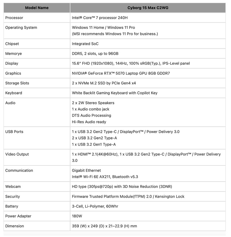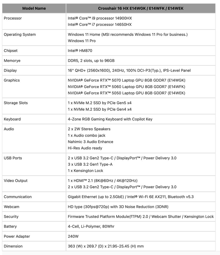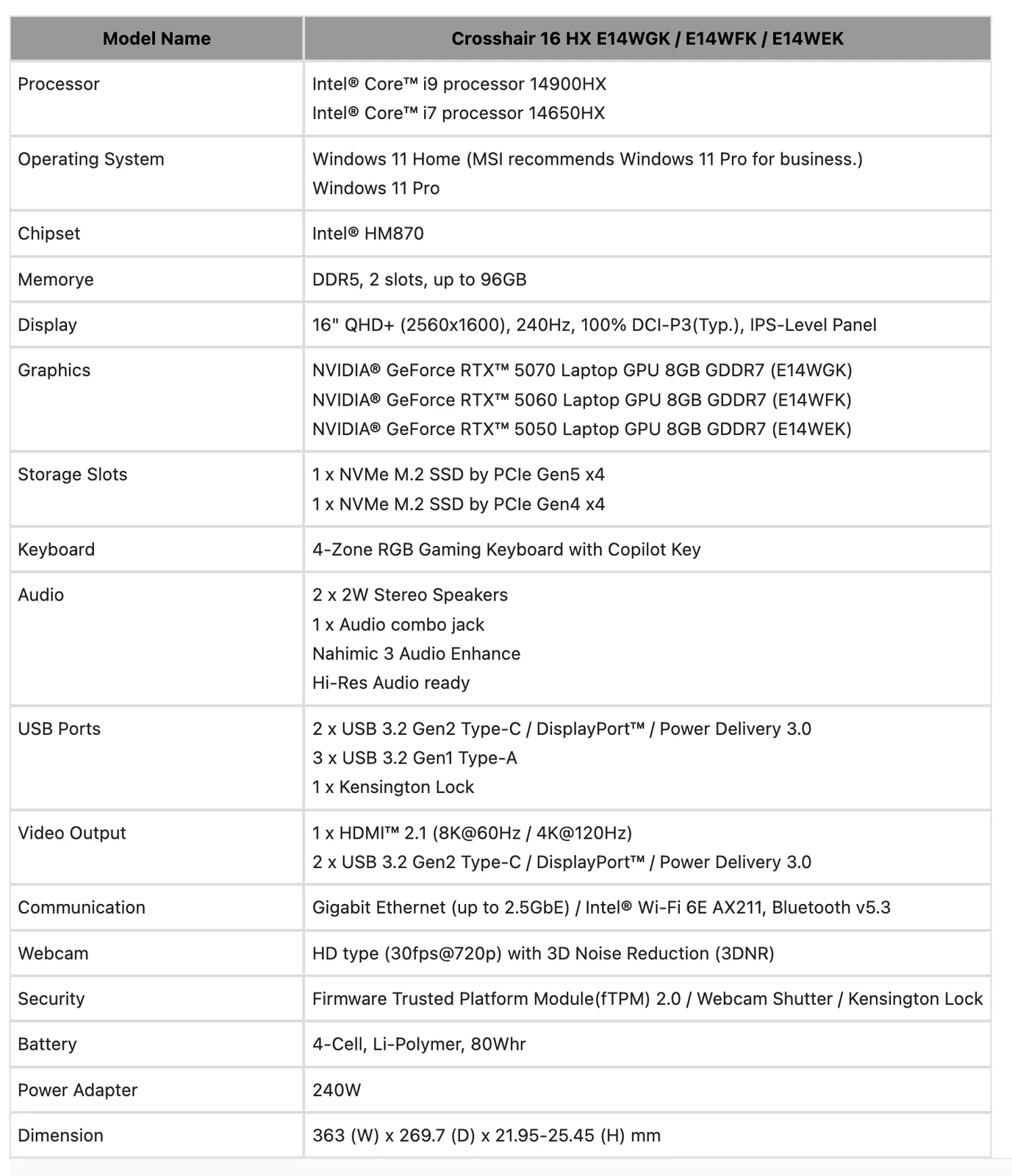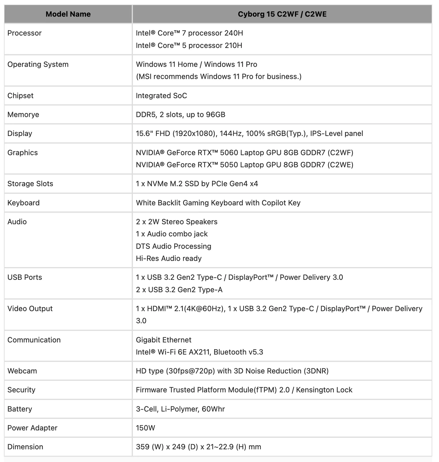 Tegelijkertijd heeft MSI de Crosshair 16 HX geüpdatet met E14WGK, E14WFK en E14WEK varianten die gebruik maken van de Core i7 14650HX of Core i9-14900HX en 8 GB versies van de GeForce RTX 5050, GeForce RTX 5060 of GeForce RTX 5070. Daarnaast heeft MSI ook drie nieuwe 15-inch Cyborg laptops onthuld, genaamd de Cyborg 15 Max, C2WG Cyborg 15 C2WF en Cyborg 15 C2WE, met vergelijkbare specificaties als de modellen van vorig jaar (momenteel $1.299 op Amazon). MSI heeft de prijs of beschikbaarheid van de nieuwe modellen echter nog niet bevestigd. Zie het persbericht van het bedrijf https://www.msi.com/news/detail/MSI-Unveils-New-Raider-and-Crosshair-Gaming-Laptops-with-Up-to-300W-Combined-Power--Delivering-Industry-leading-Performance--148460 voor meer details.
