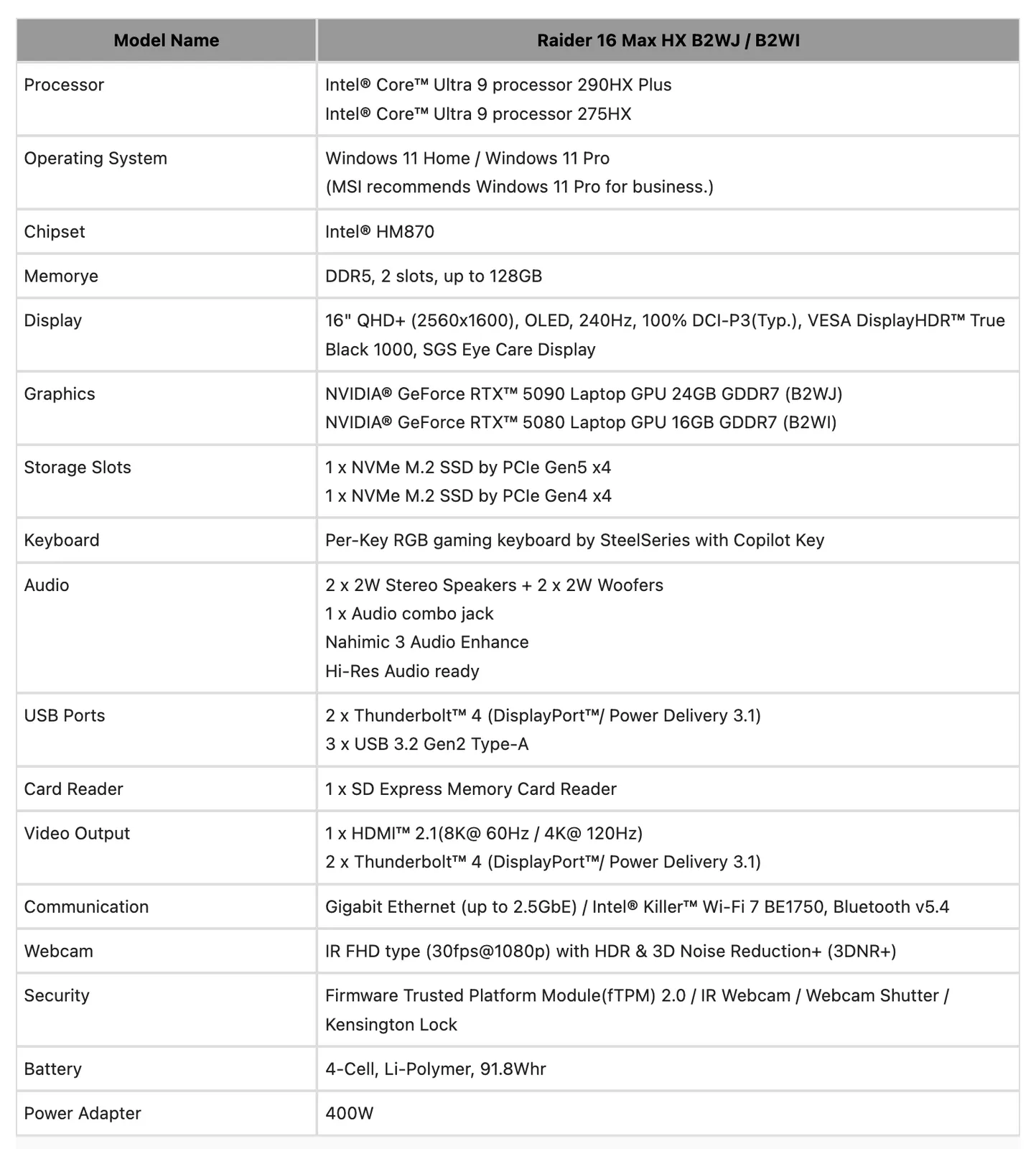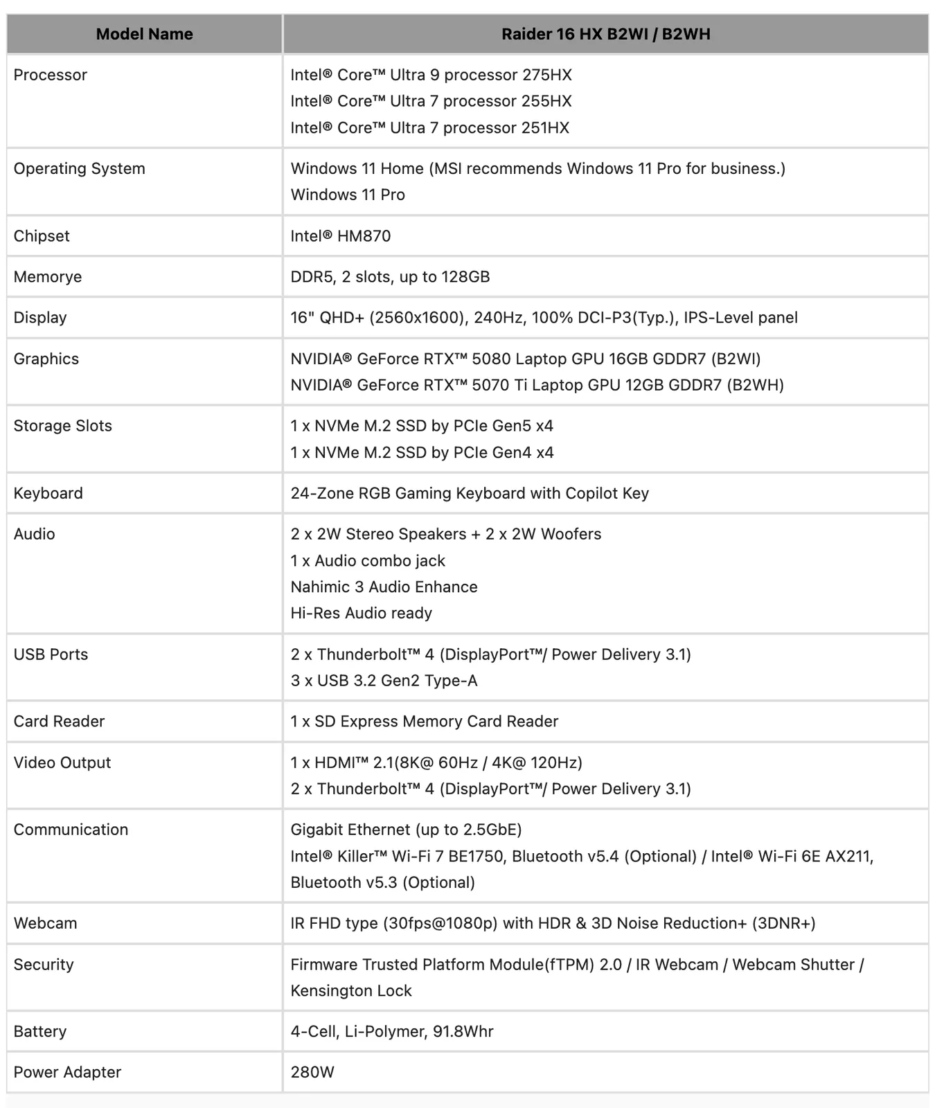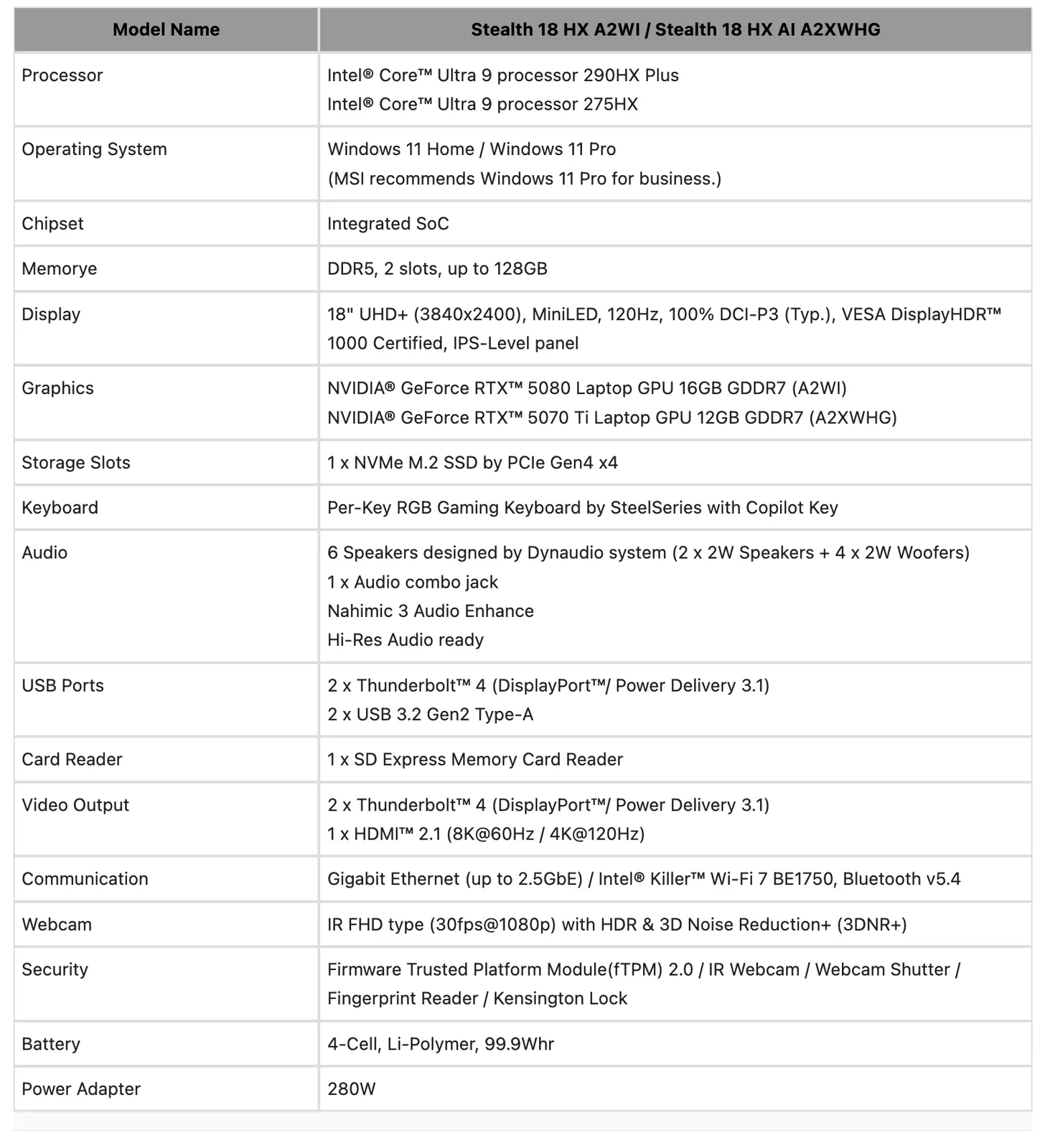 Nu is MSI ook van de partij met acht nieuwe laptops in de Raider- en Stealth Titan-series. Specifiek heeft het bedrijf de volgende laptops gepresenteerd, ondersteund door Core Ultra 9 290HX Plus processoren: