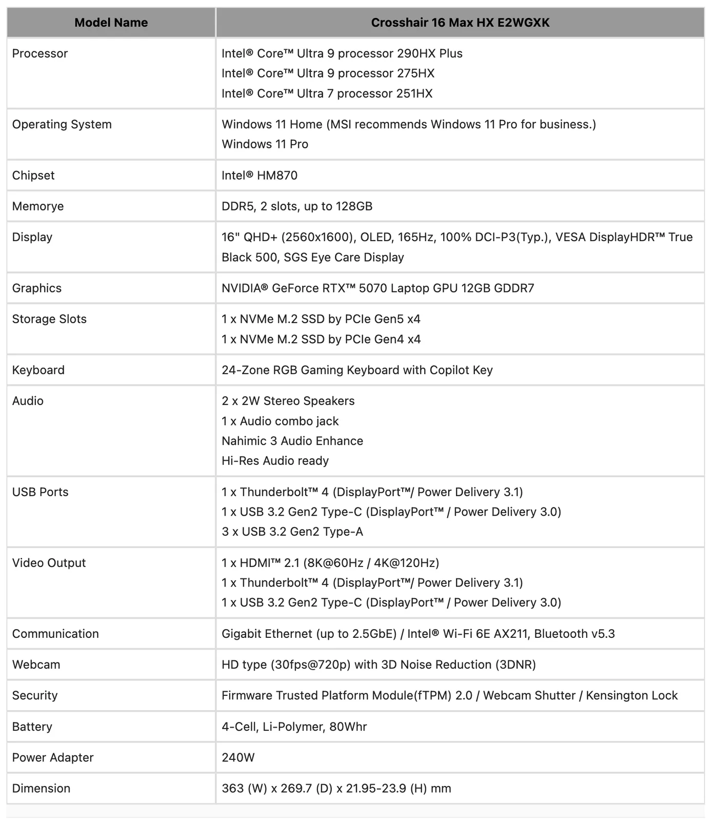 Overigens is de Crosshair 16 Max HX E2WGXK de eerste laptop waarvan is bevestigd dat hij wordt uitgebracht met Nvidia's nog niet uitgebrachte 12 GB RTX 5070 laptop GPU. Ondertussen zijn de andere zeven laptops in de lijst hierboven voorzien van de GeForce RTX 5070 Ti, GeForce RTX 5080 of GeForce RTX 5090.