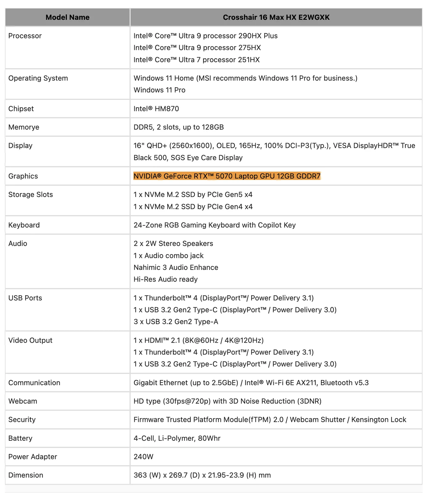 De aankondiging van vandaag bevat ook een verwijzing naar een GPU die Nvidia nog niet formeel heeft onthuld. MSI vermeldt namelijk dat zijn Crosshair 16 Max HX E2WGXK exclusief verkrijgbaar zal zijn met de "Nvidia GeForce RTX 5070 Laptop GPU 12GB GDDR7".