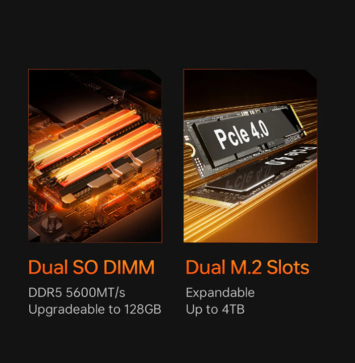 Machenike is van plan om de GTS te verkopen als een kaal systeem zonder RAM of opslag om te kunnen concurreren met vergelijkbare systemen zoals de GMKtec Evo-T1 (momenteel $999 op Amazon) die die we eerder dit jaar hebben beoordeeld. Als alternatief zou de mini-pc geconfigureerd kunnen worden met maximaal 128 GB RAM en 2 TB opslag via SODIMM en M.2 2280 slots. Zoals de afbeelding hieronder laat zien, heeft Machenike de GTS ook volgestopt met veel poorten, ondanks de afmetingen van de behuizing van 147 x 147 x 61 mm.