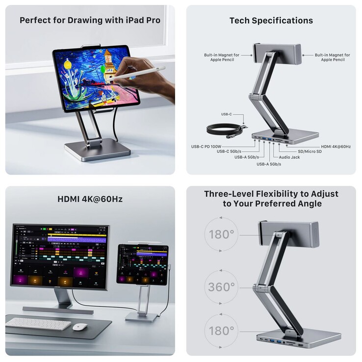 De Invzi MagHub 3 is een praktische standaard voor tablets. Hij kan apparaten met een schermdiagonaal van 4,7 tot 12,9 inch vasthouden met zijn klem. Een Apple Pencil kan magnetisch aan een van de aluminium houders worden bevestigd. Dankzij in totaal drie gewrichten kan de tweedelige arm op verschillende manieren worden versteld om het best mogelijke zicht op de vastgeklemde tablet in staand of liggend formaat te bieden.