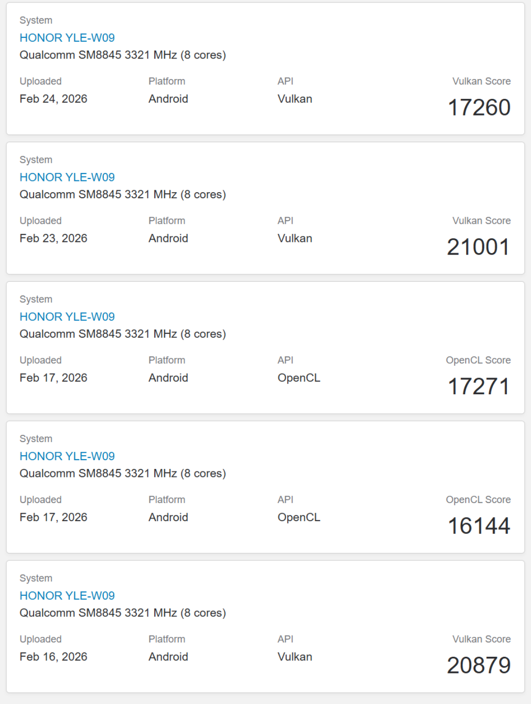 De prestaties van de ingebouwde Adreno 829 GPU blijven echter achter bij de verwachtingen. Hoewel het voorlopig om een beperkte dataset gaat, liggen alle OpenCL- en Vulkan-scores die tot nu toe zijn behaald aan de lage kant van wat we gewend zijn van high-end chipsets zoals de Dimensity 9400+, Snapdragon 8 Elite of de Snapdragon 8 Elite Gen 5. Zie ons eerdere artikel voor meer details over de MagicPad 4.